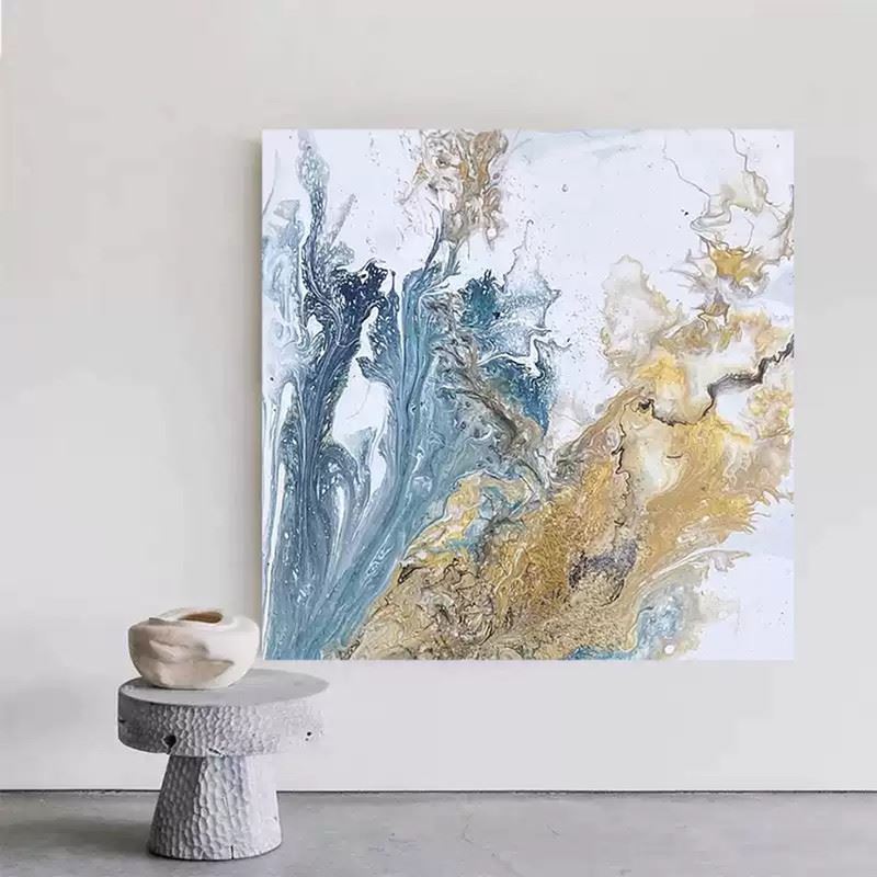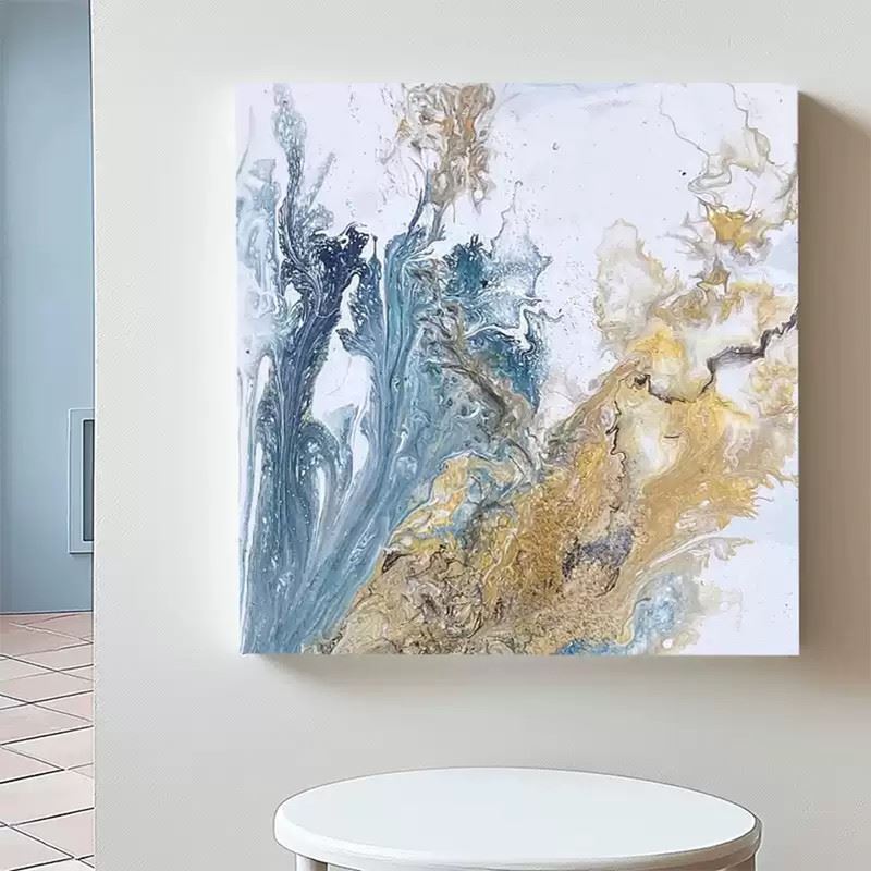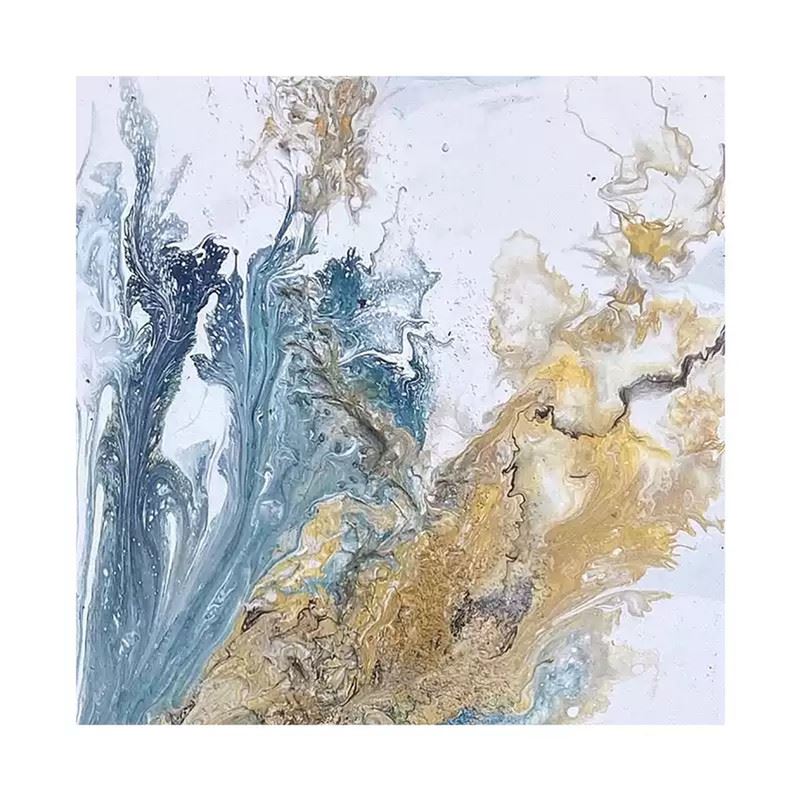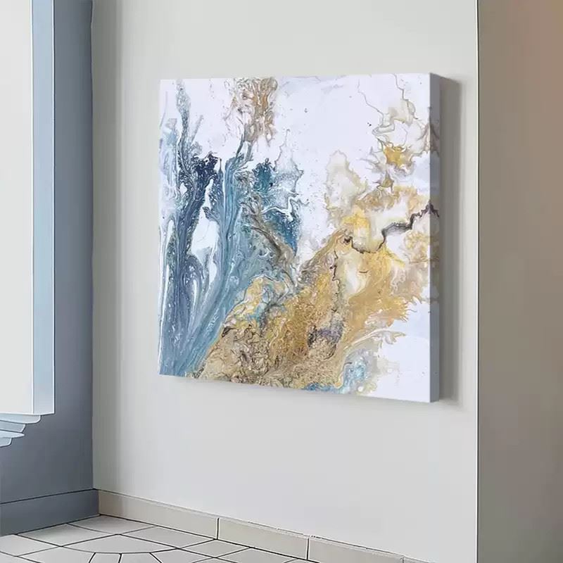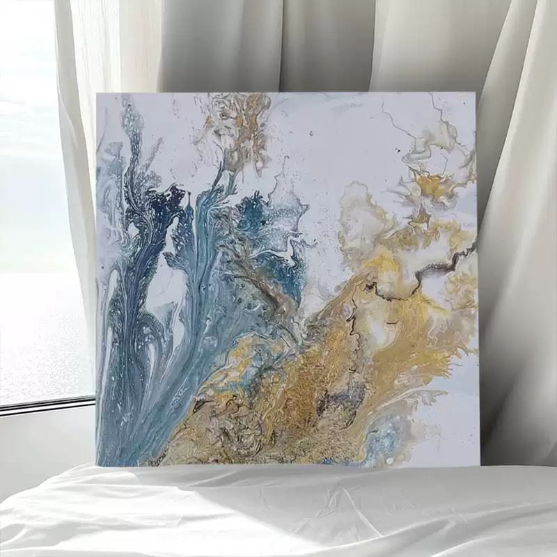 This artwork uses flowing colors and delicate textures to depict the merging of clouds and rocks in nature. The swirling blues and golds resemble clouds and waves intertwining over the sea, creating a dreamlike play of light and shadow, as if drifting within the embrace of nature. Dimensions: 24 x 31 inches.