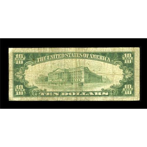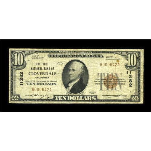 <B>Cloverdale, CA</B></I> - $10 1929 Ty. 1 <B>The First NB</B></I> Ch. # 11282<BR> This Sonoma County locale had only one issuer and managed to issue more than $400,000 in National Bank Notes. To date, only fourteen examples are known extant with the last auction appearance in 2005. This piece is pleasingly original. <B>Very Good-Fine.</B></I><BR><I>From The Kansas City Collection.</B></I><BR><BR><b>Shipping:</b> Coins & Currency (<a target="_blank" href="http://www.heritageauctions.com/common/shipping.php">view shipping information</a>)