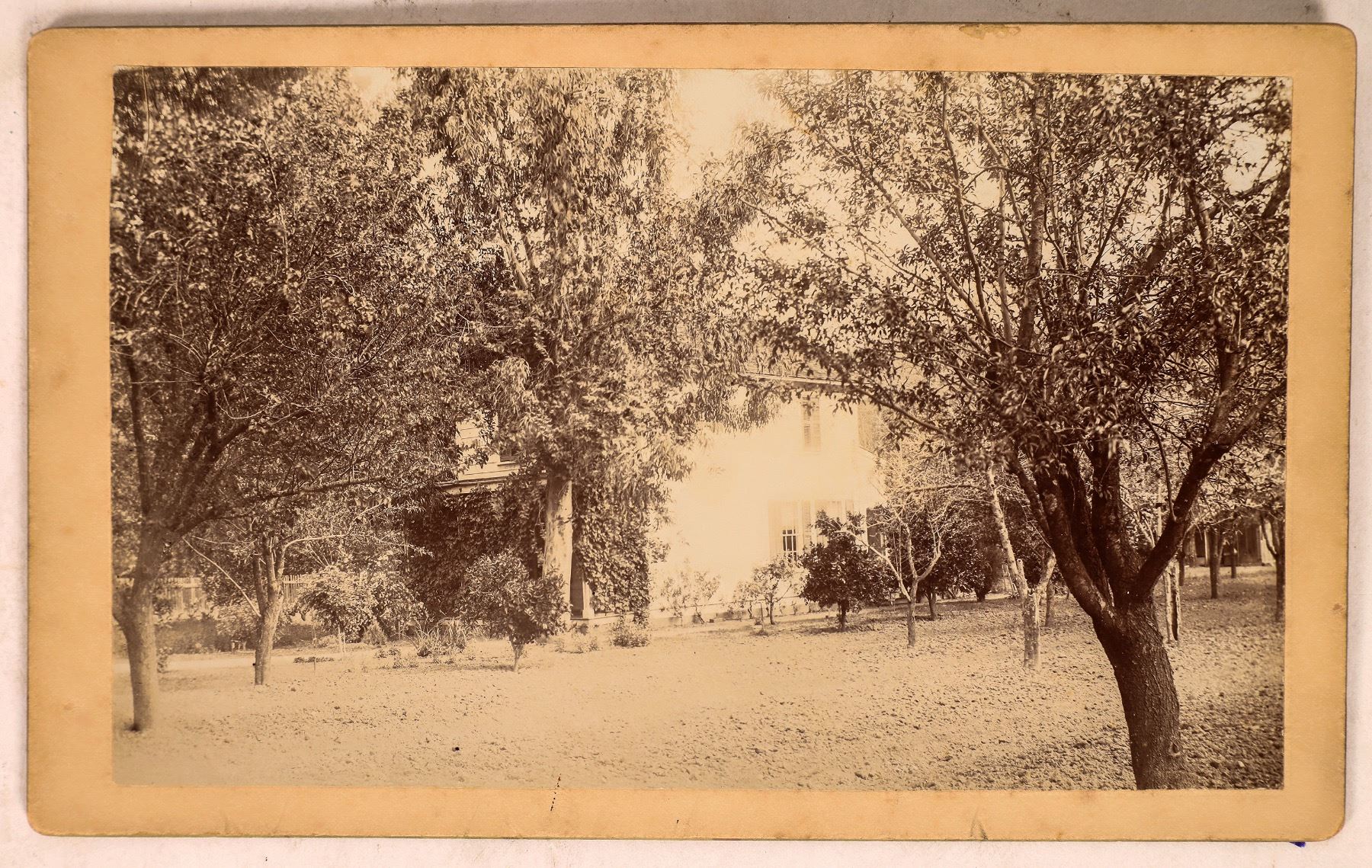 Photograph of two-story white house surrounded by trees, labelled on the reverse in pencil as "Luther's place Cloverdale." 5.25 x 8.25" Stamped on the reverse in blue print: "W.W. Fairbanks, Photographic Artist. Cloverdale, Cal." According to Mautz, Fairbanks operated in Elk, Point Arena (1888), Los Angeles (1896), and then Cloverdale in 1900. Cloverdale is in Sonoma County, California. Possibly Luther Burbank's residence?