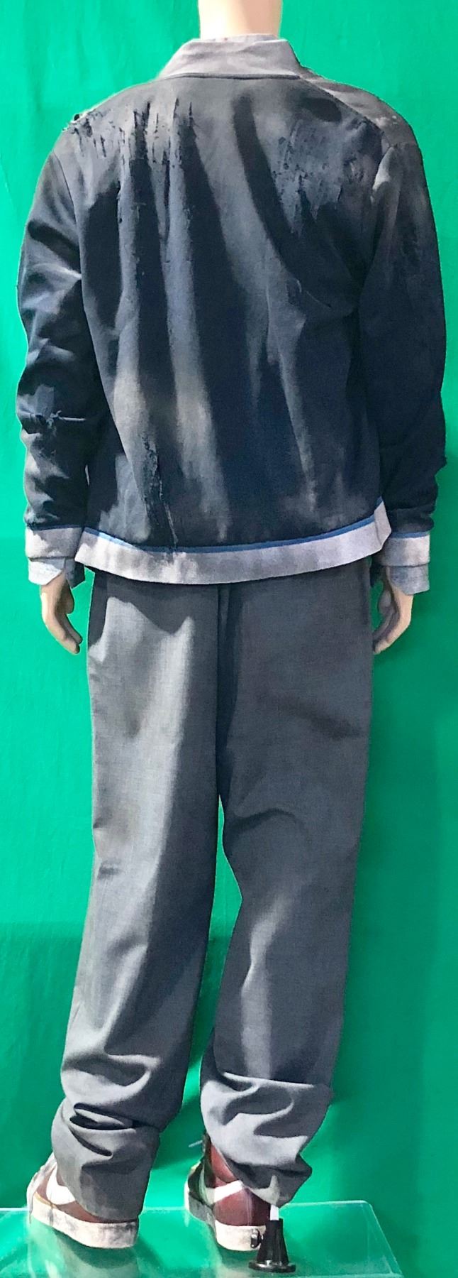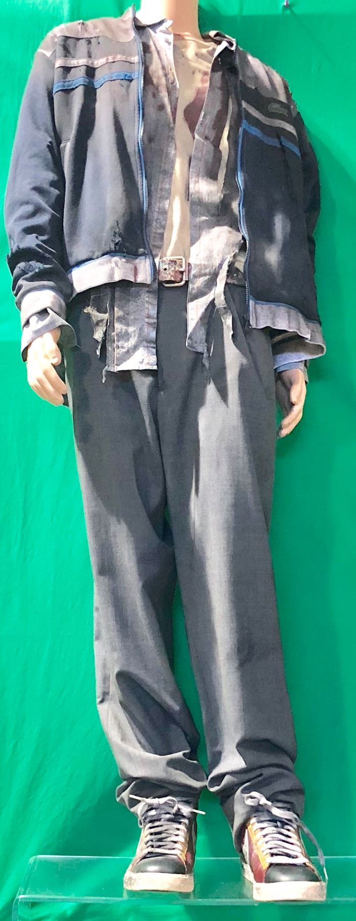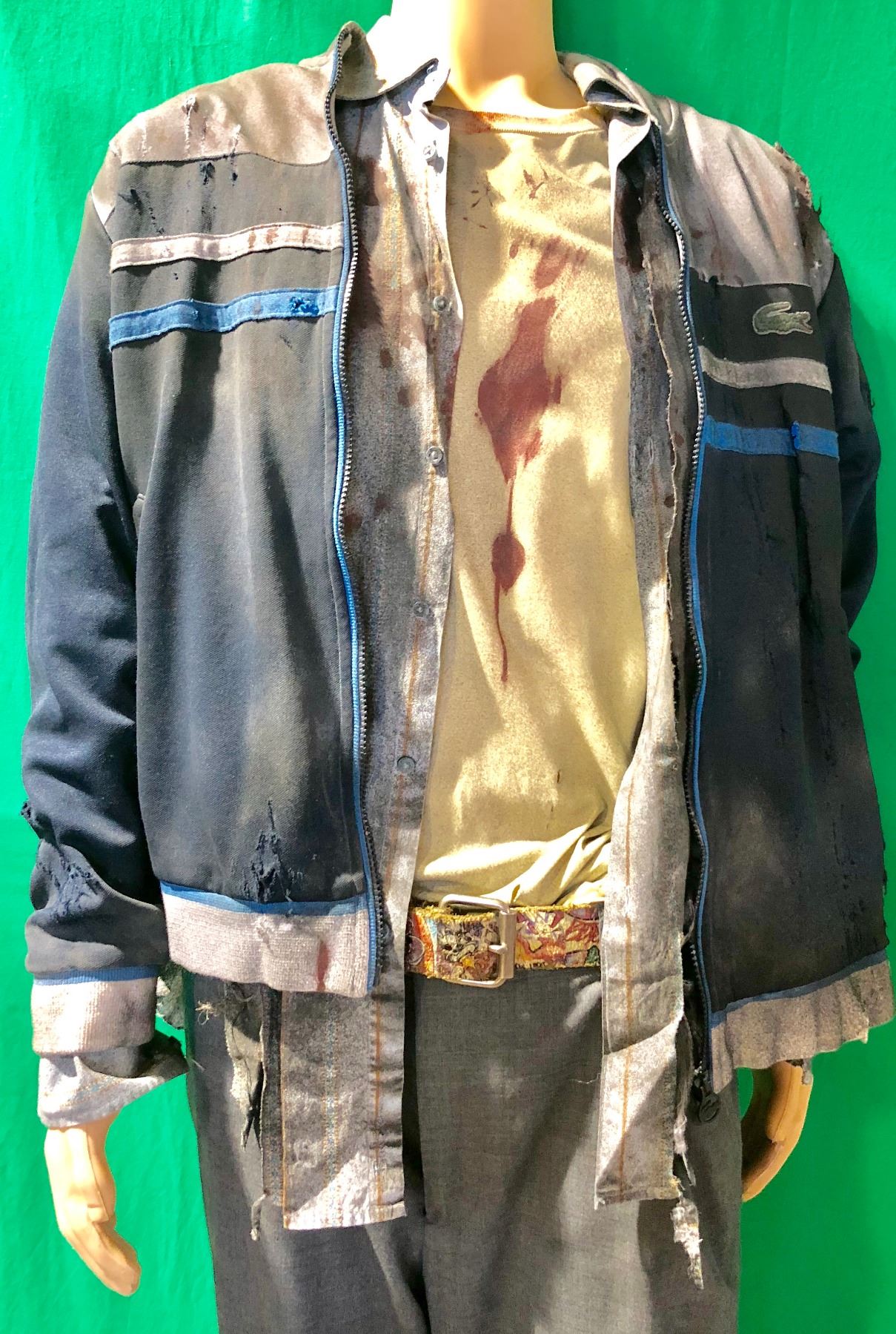 This amazing outfit includes a soiled and bloodstained light-blue "Ben Sherman" button-up shirt with brown stripes and blue pattern, a sullied and bloody yellow "J. Crew" short-sleeve t-shirt, grey dress pants, red, yellow, and black leather Nike's and a white, blue, and navy "Lacoste" zip jacket. Wardrobe tag is included.
