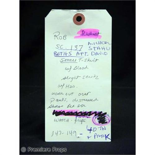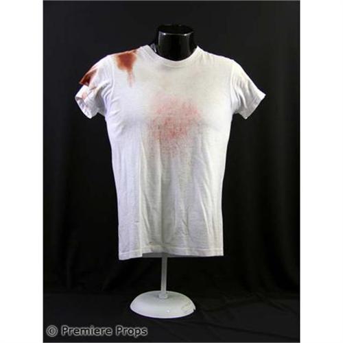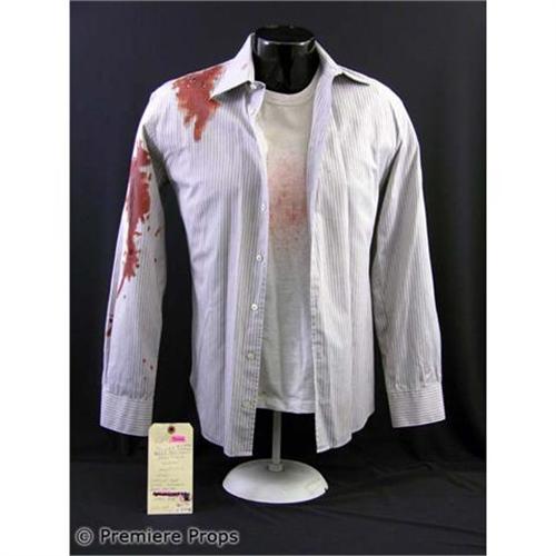 CLOVERFIELD - Some Thing Has Found Us. Straight from the set of the furious monster movie, this is Rob's (Michael Stahl-David) screenworn hero costume. This costme features a blue with white stripes button up collared with blood stains and holes on the right shoulder "John Varvatos USA" shirt" and a white with dirt and blood stains on right shoulder and front "Calvin Klein" t-shirt. Includes the original wardrobe tags! Don't hesitate to add this key costume to your movie memorabilia collection today! (CLF1031)