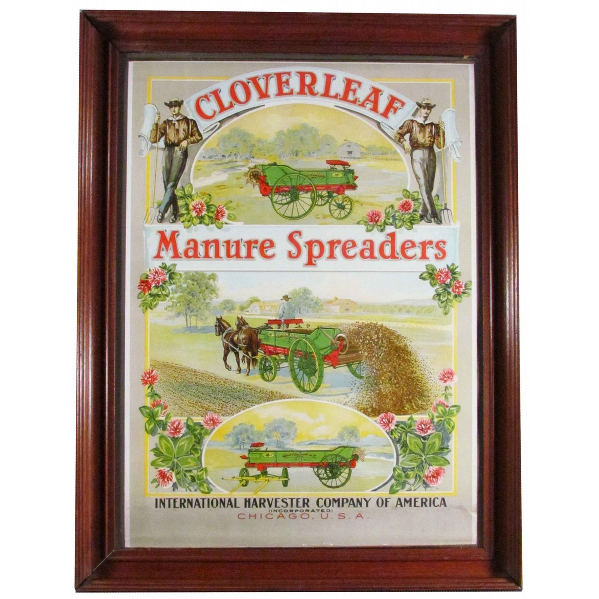 Cloverleaf Manure Spreaders Paper Sign for the International Harvester Company of America. Beautiful color and graphics. Original bands top and bottom. Small stain and tear 5:00 otherwise excellent condition. Period walnut frame. 17 X 23 1/2 inches image only.
