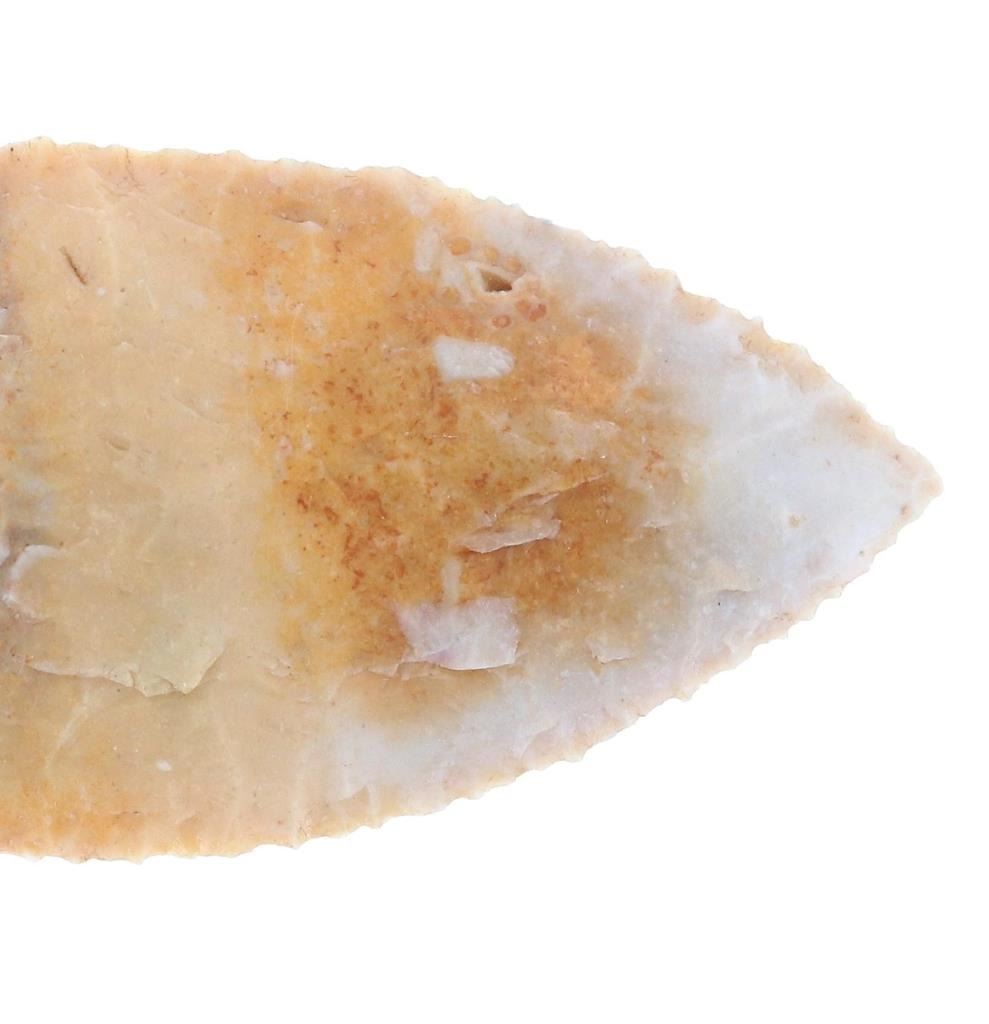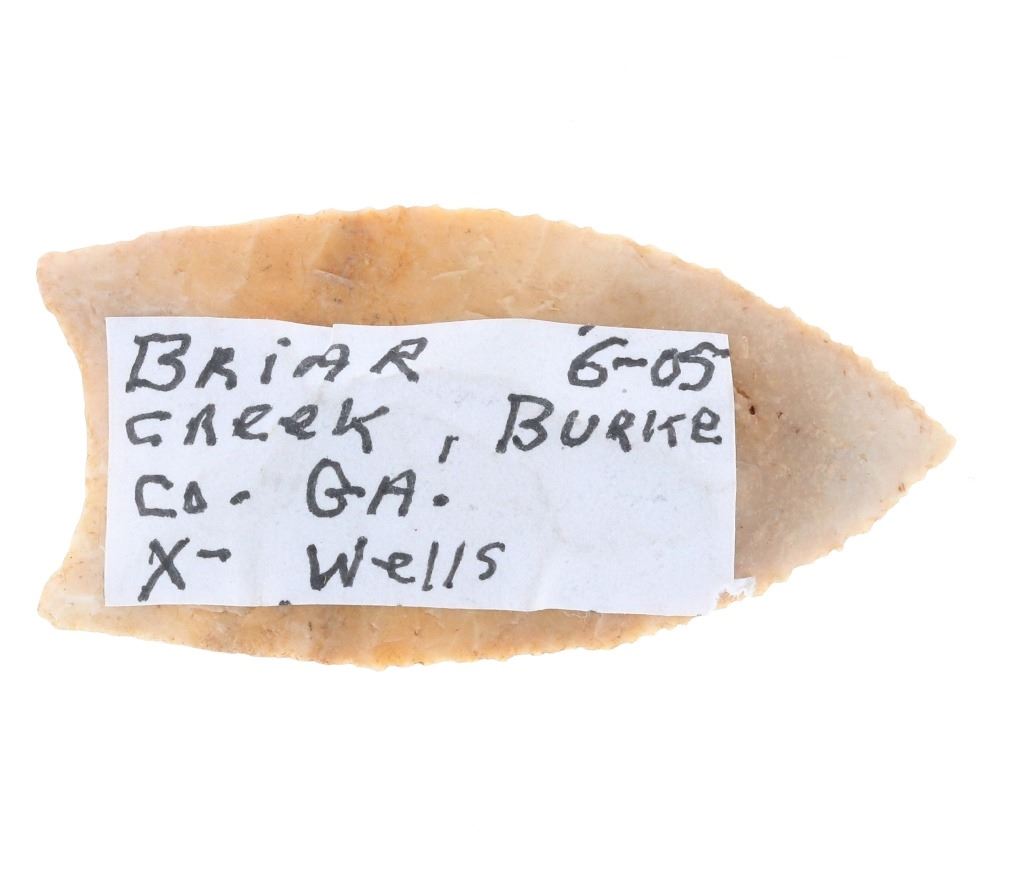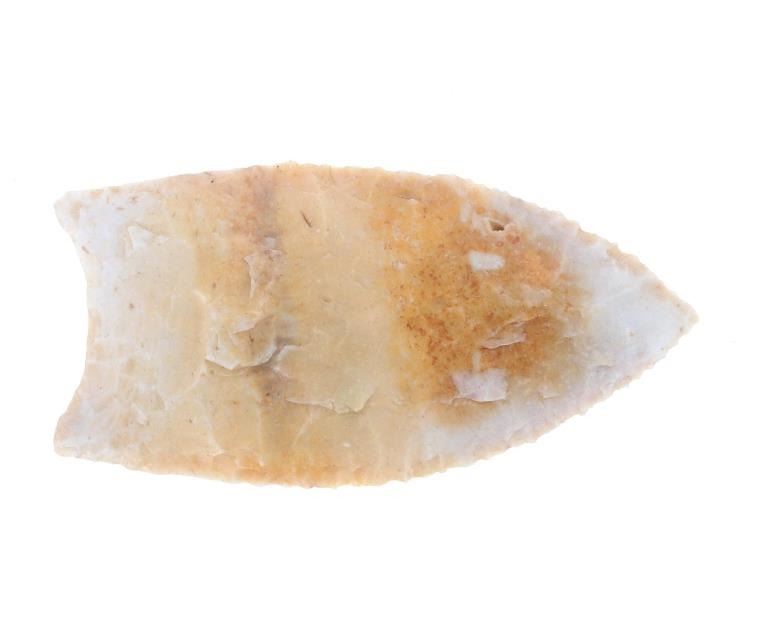 Featured in this lot is this Clovis cluster fluted point from the Paleo Period and aged from 15,000 - 10,000 B.P. The point features a small semi-triangular point with an excurvate shape to the blade. The point is 1/4 fluted with slight shoulders and contracting point. The point is knapped from a cream and orange chert material. The condition of this point is good, with no obvious signs of damage. The measurements of this point are 2 1/4" x 1 1/8" x 1/4". Provenance: This point is from the private collection of Wells and taken from Briar Creek, Burke County, Georgia.