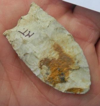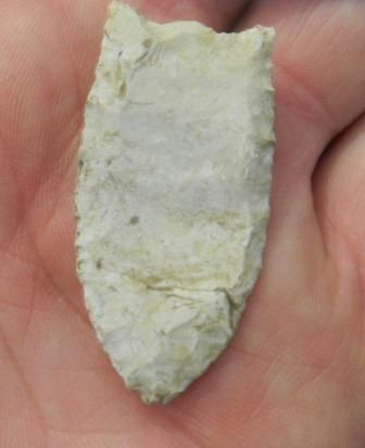 Clovis point, white chert, found in Montana, good patina, approximately 1 13/16 by 7/8 inches Shipping $15.00.