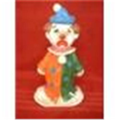 Bank of a Clown with a smile on one side and a frown on the other side. The Clown Bank is a bright orange and green with a blue hat. This bank does have a slot with plug on the bottom to get the money out and is marked "Decorama Inc. Dallas Tx. Japan". It does look like the neck has been glued back on but other than that it is good condition with no other chips or cracks. The bank measures 6 inches wide and 11.25 inches tall.