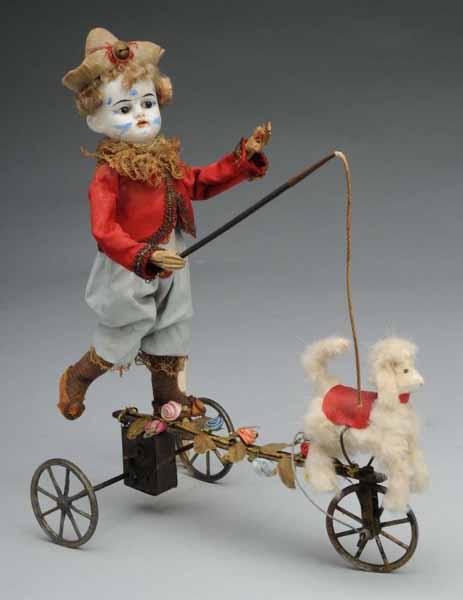 Description Painted white bisque head clown with glass eyes, mohair wig, nice costume, drives a fuzzy poodle with leather face. Mechanism does not work. Condition (Very Good). Size 9" x 11".