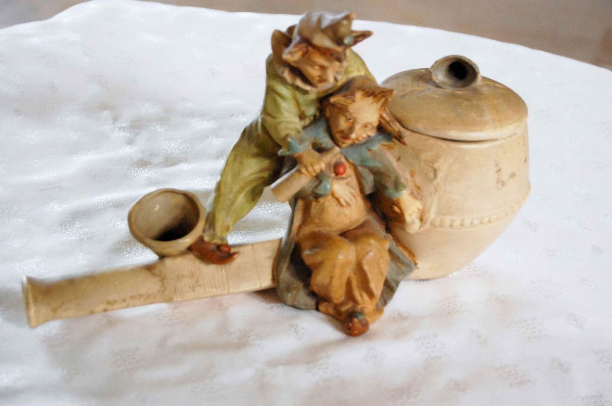 Clown Figures Lounging on a pipe Tobacco Humidor. Pipe bowl is the humidor. Small chip on the top hat finial, some staining otherwise good condition. 7 inches tall.