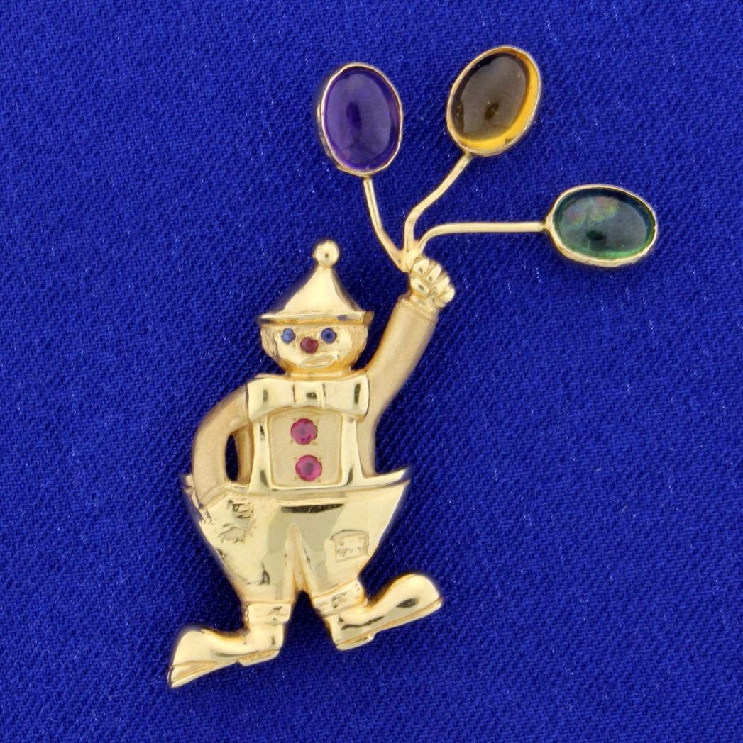In 14k yellow gold this pin is 2inches long. It contains two 1mm round sapphires and three small rubies. The pin also contains amethyst, citrine & peridot 1.5ct oval cabochon gemstones. 9.1g
