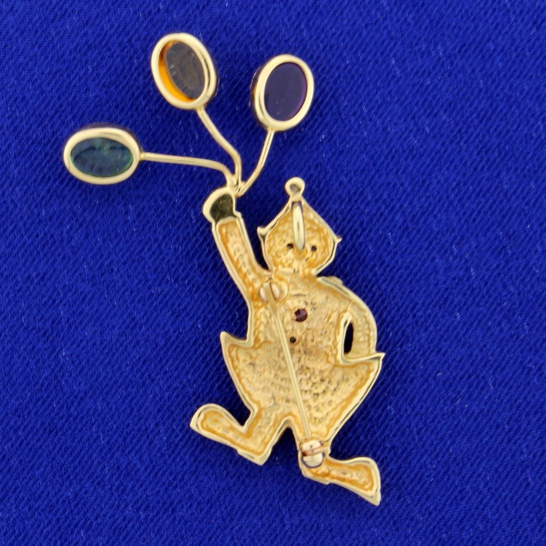 In 14k yellow gold this pin is 2inches long. It contains two 1mm round sapphires and three small rubies. The pin also contains amethyst, citrine & peridot 1.5ct oval cabochon gemstones. 9.1g