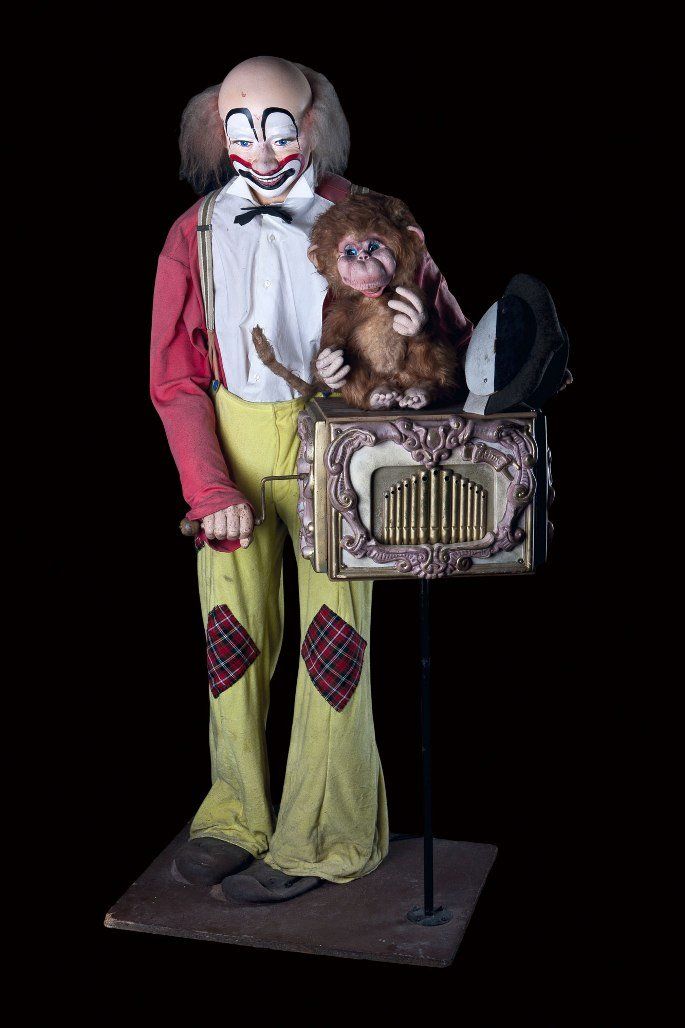 Clown with Monkey Organ. Window display electrified. Museum's quality. 70 x 60 x 168cm. Manufacturer unknown, probably France, circa 1950.
