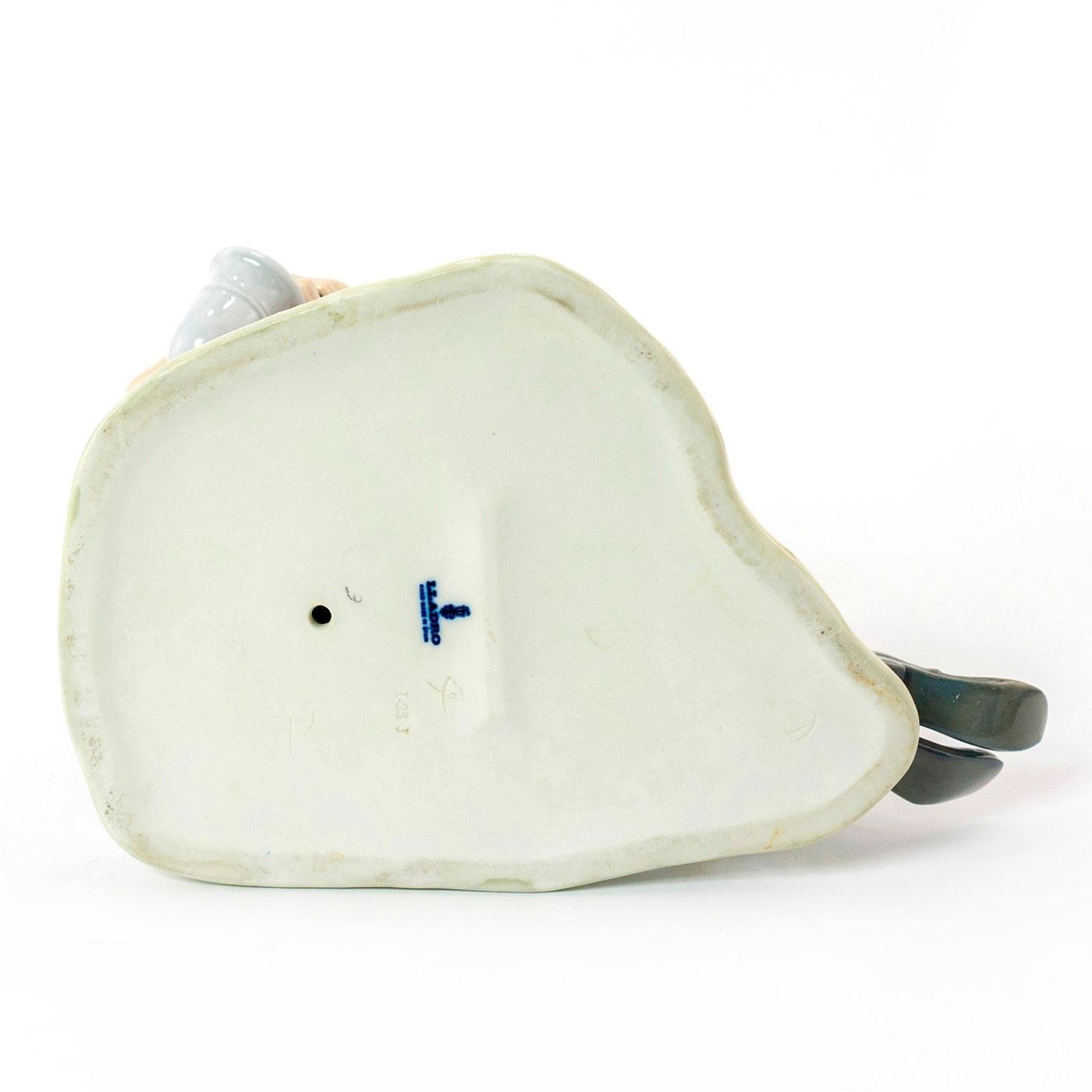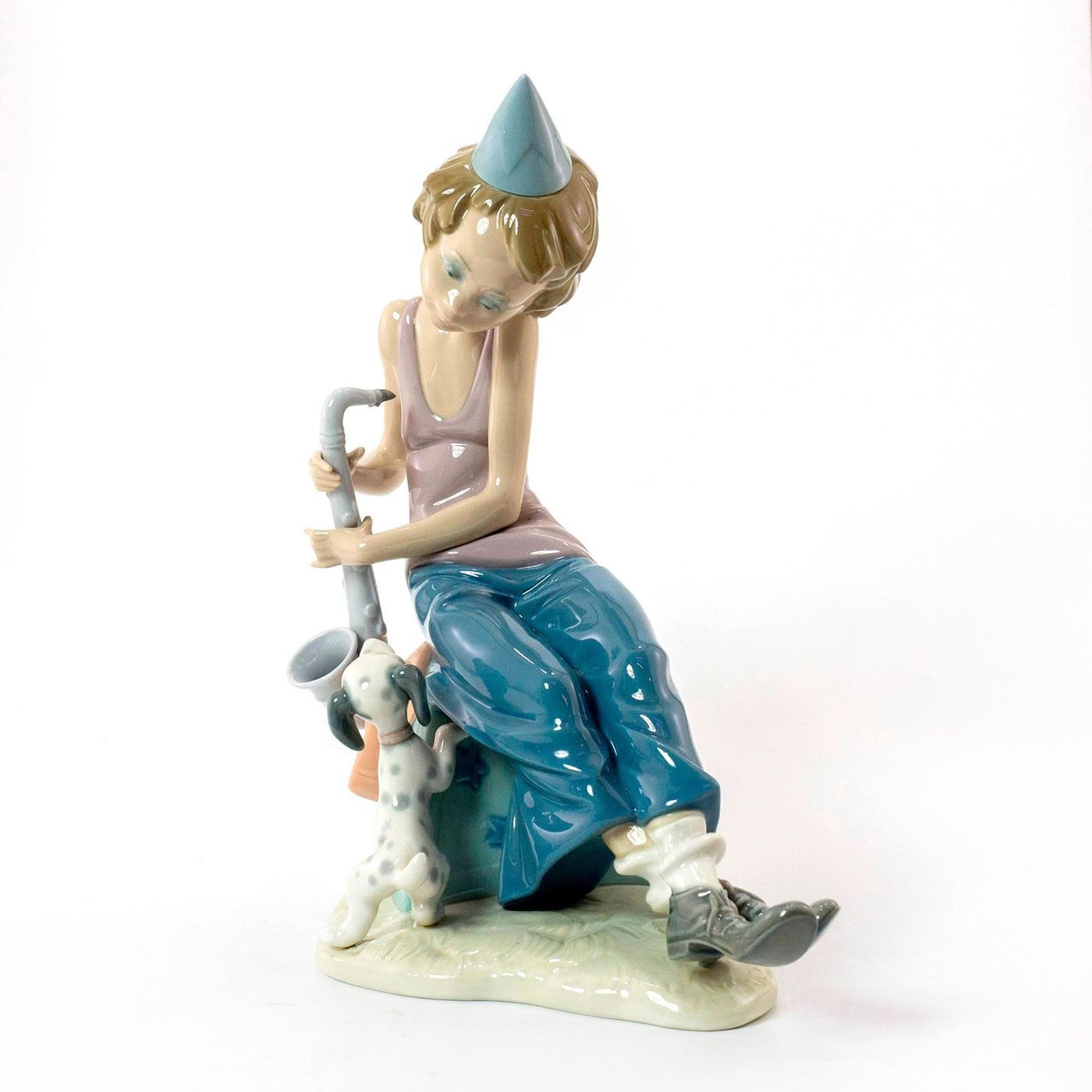 Seated boy with a blue pointy hat holding a saxophone, a white spotted dog in front of him. Glazed finish. Lladro backstamp. No original box.