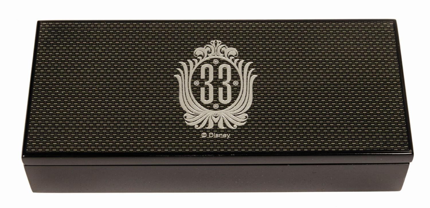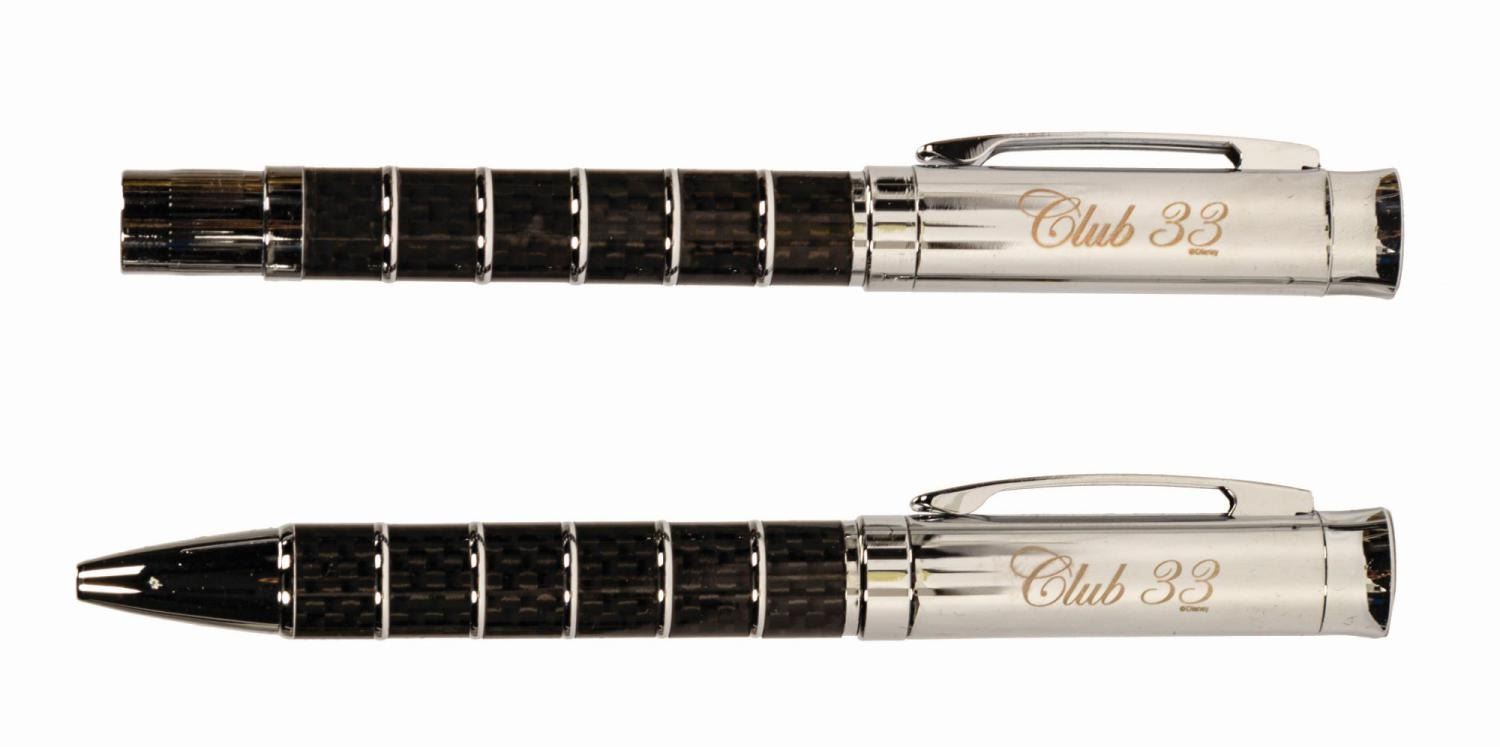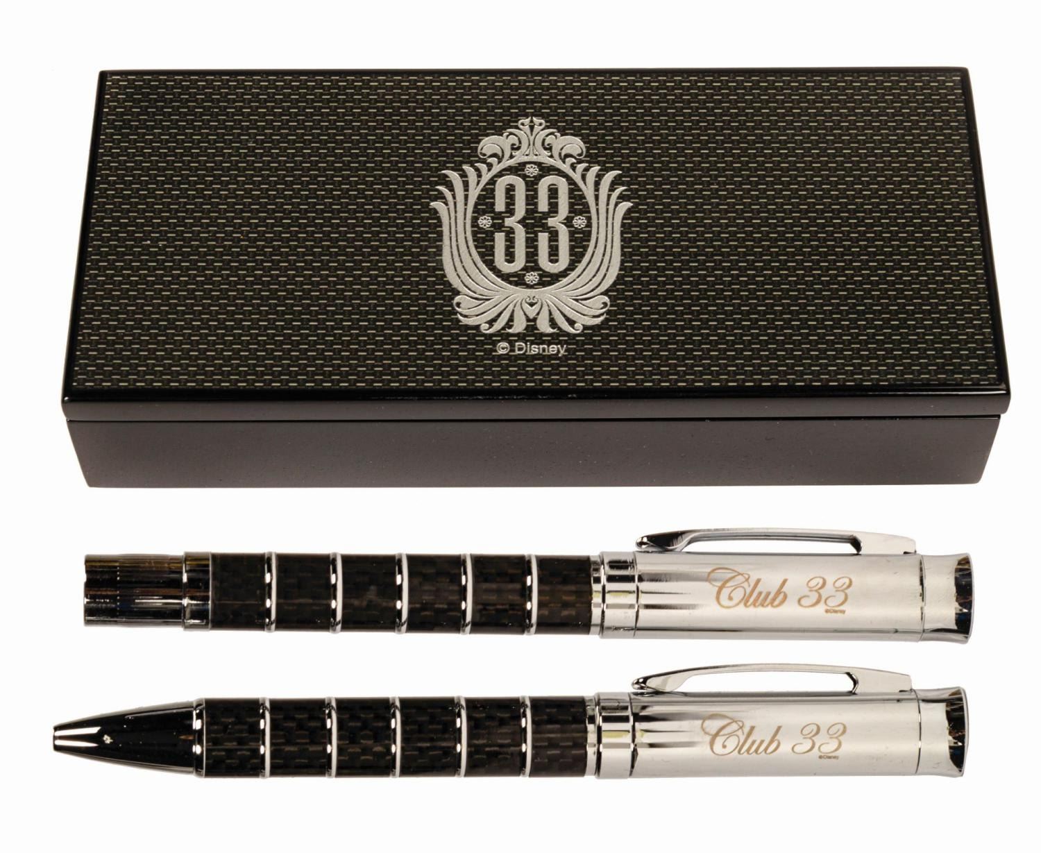 (Disneyland, c.2010s) A boxed pen set from Disneyland's exclusive Club 33. This set includes two stylish metal ballpoint pens featuring the club's logo. The pens come in a decorative box with the club's logo on the hinged lid. The display box measures 3.5"x8" and 1.5" thick. The set is in very fine condition.