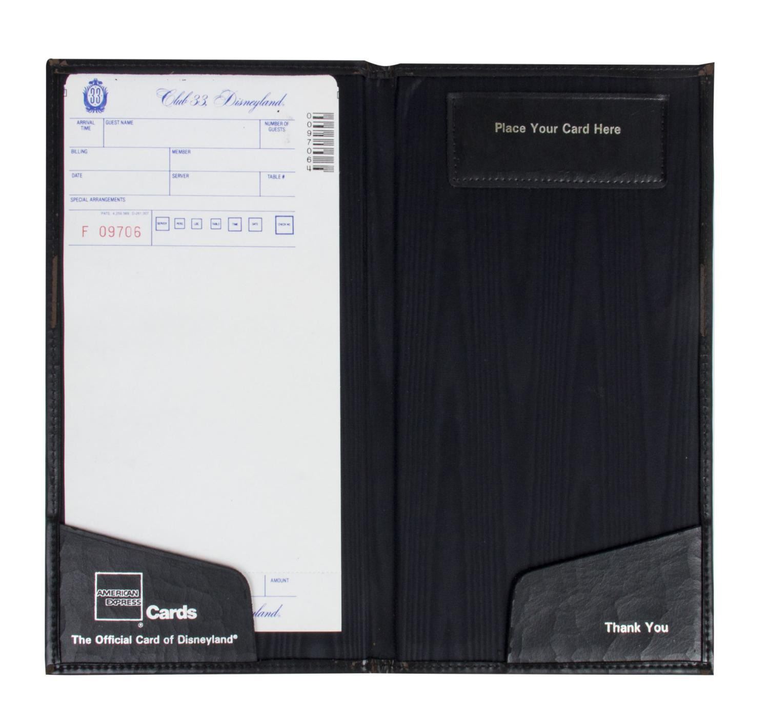 (Disneyland, c.1990s) An original check cover from Disneyland's exclusive Club 33. This check cover features a large gold logo for the club and contains an unused paper check slip inside. The padded cover measures 10.75"x5.75" and is in fair condition with thin cracking throughout the surface due to a material flaw from the production of these check covers. The cover still displays very nicely, however it is somewhat delicate.
