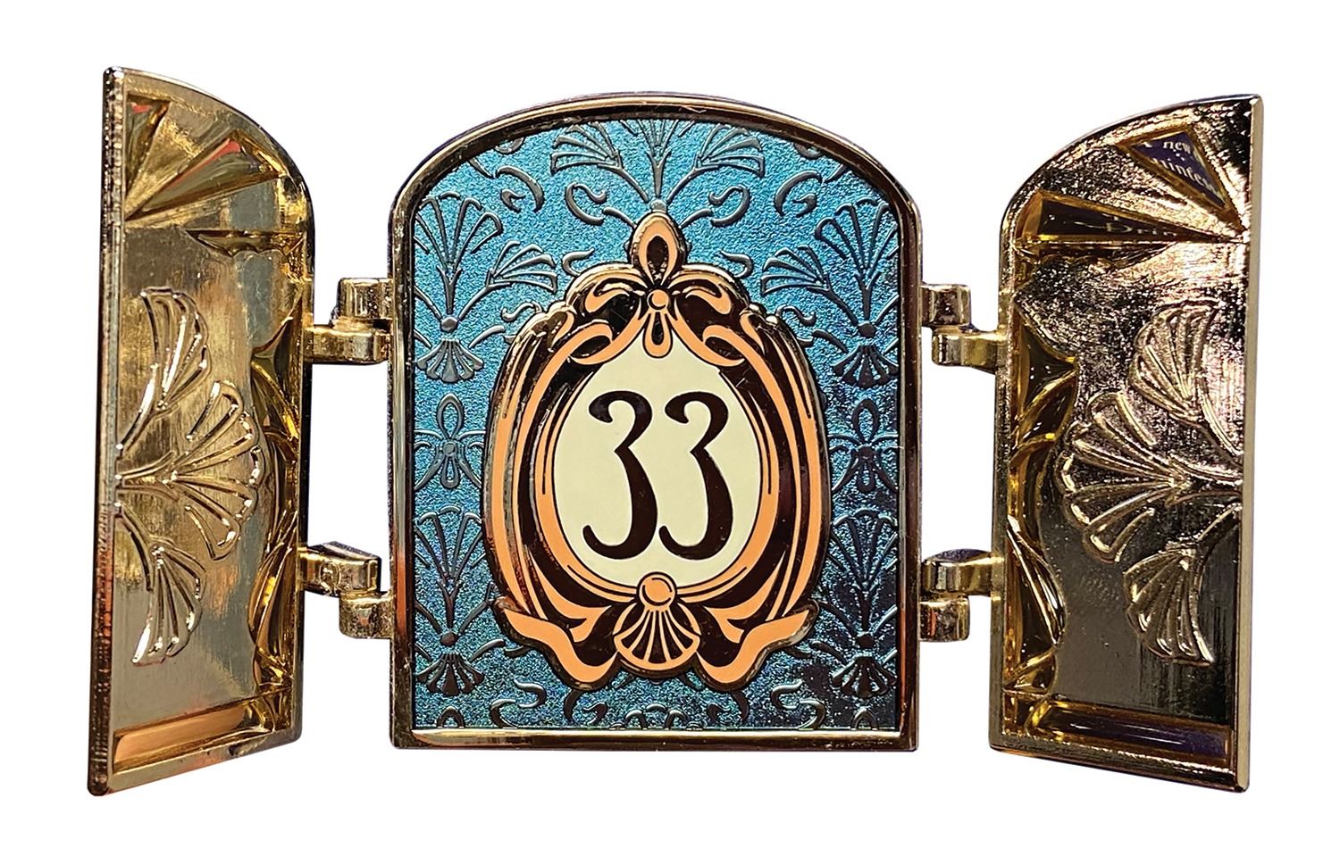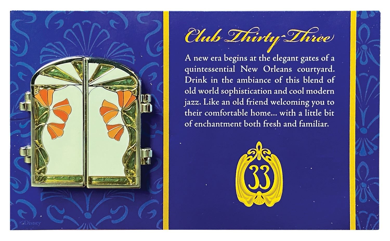 (Disneyland, 2014) An enamel pin commemorating the re-Imagineering and grand re-opening of Club 33. The faux stained glass outer doors of the pin recreate the stained glass doors added to the Court of Angels area of Disneyland that now serves as a New Orleans-themed courtyard for Club 33. They open on hinges to reveal the updated, Jazz Age-inflected Club 33 logo. Measuring 1.75"x2", the pin is in fine condition and presented on its original card packing.
