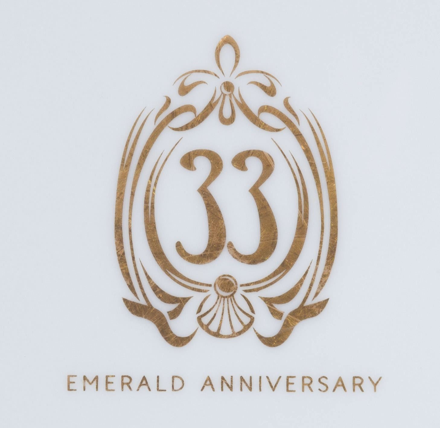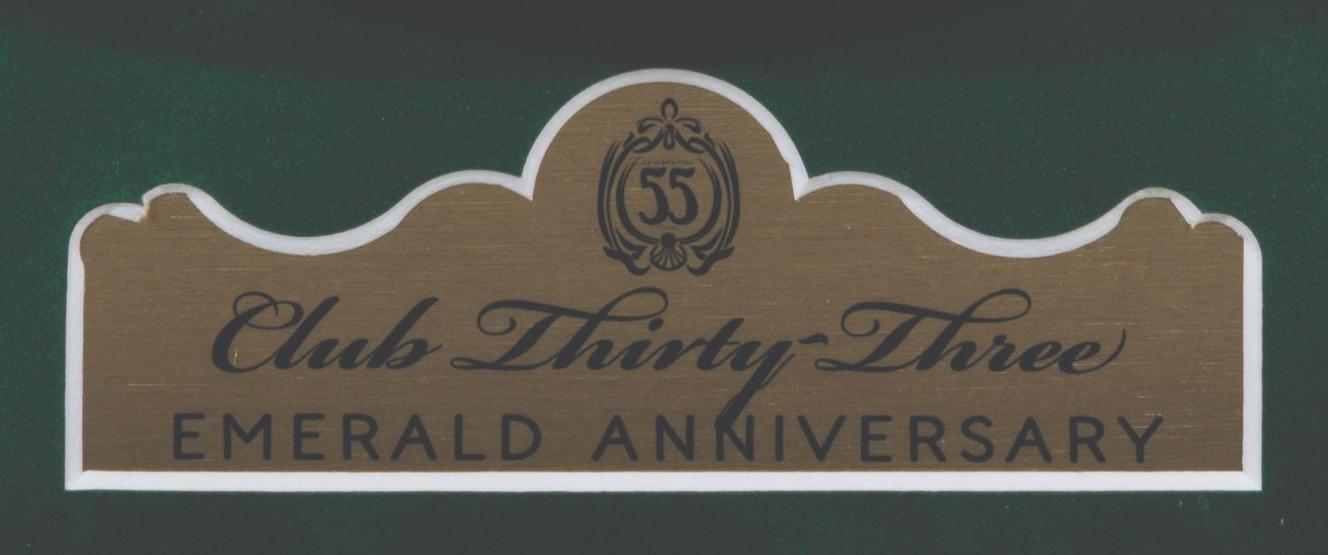 (Disneyland, 2022) A framed Club 33 Emerald anniversary charger plate released at the exclusive Club in celebration of their 55th anniversary. The 11" diameter plate is presented in a 16.5" x 17.5" x 2" deep shadow box frame. The piece is in fine condition.