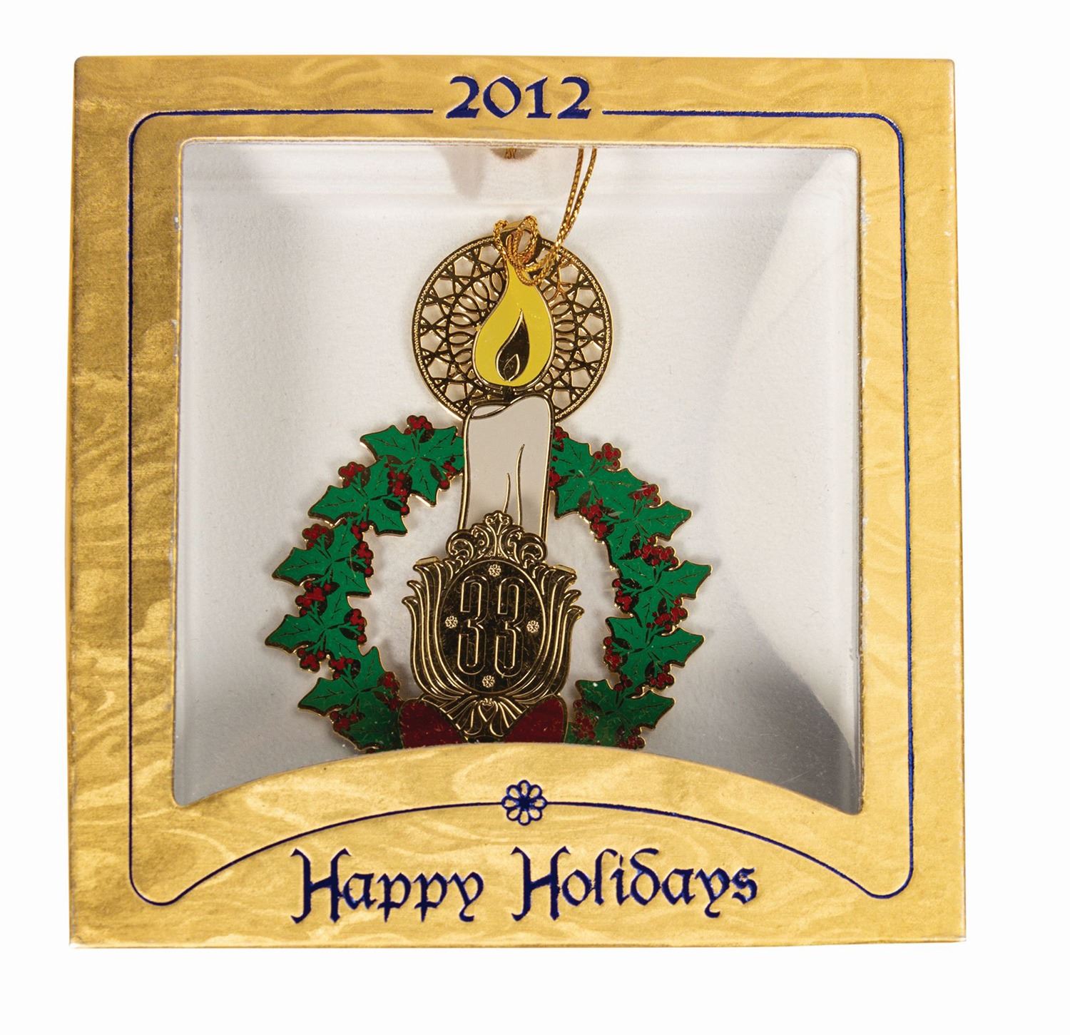 (Disneyland, 2012) A rare Club 33 Happy Holidays ornament from Disneyland. This ornament was a Club 33 exclusive gift sent out to members only and comes in the original Club 33 box that measures 5"x5" and is 1" tall. The item is in fine condition with minor wear to the box.