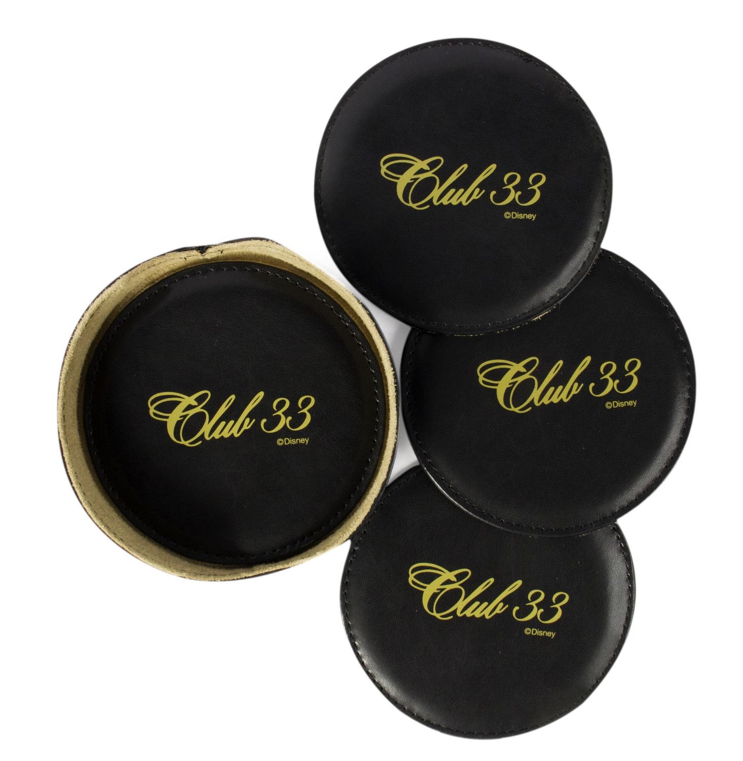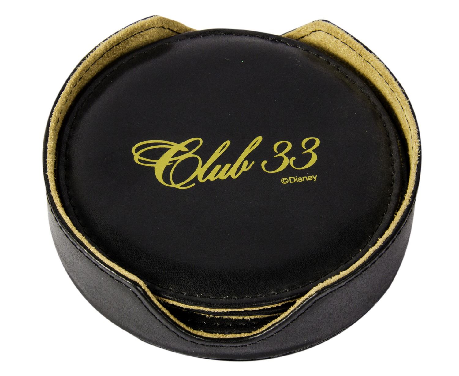 (Disneyland, c.2000s) A set of (4) leather coasters from Disneyland's exclusive "Club 33". The set features a black top with "Club 33" written in gold font, and a brown base. They come in a matching holder. The set measures 5" in diameter and 1.5" tall within the holder, and the set is in very good condition.
