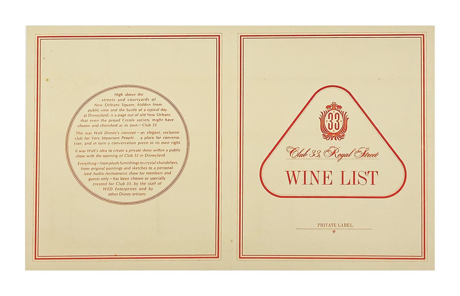 (Disneyland, c.1967) An original Club 33 menu and wine list. The menus are from the early years of the exclusive club, and are exceptionally rare. Measuring 8"x13" to 16"x8", the menus are in very good condition with some minor staining on the wine list.