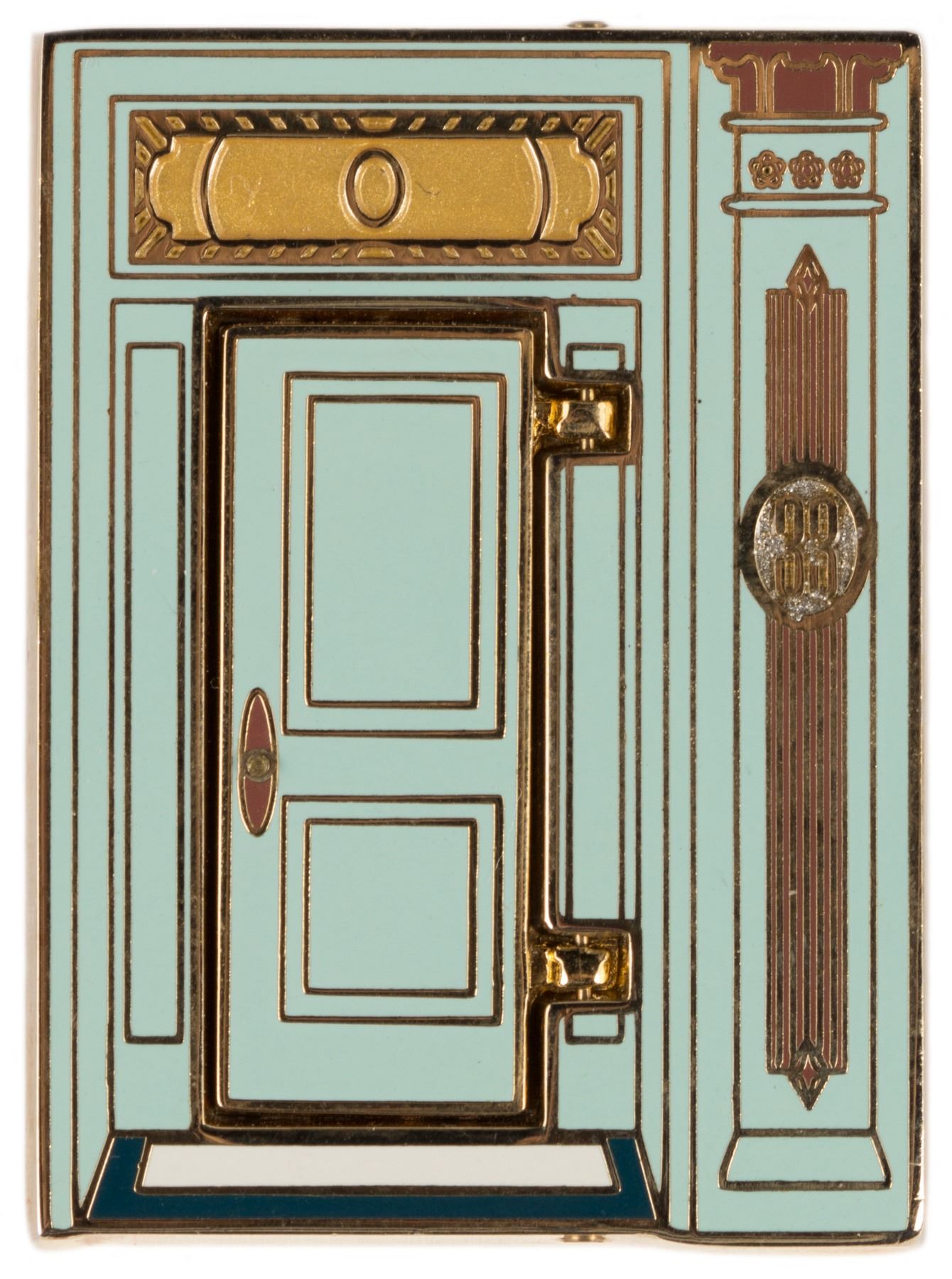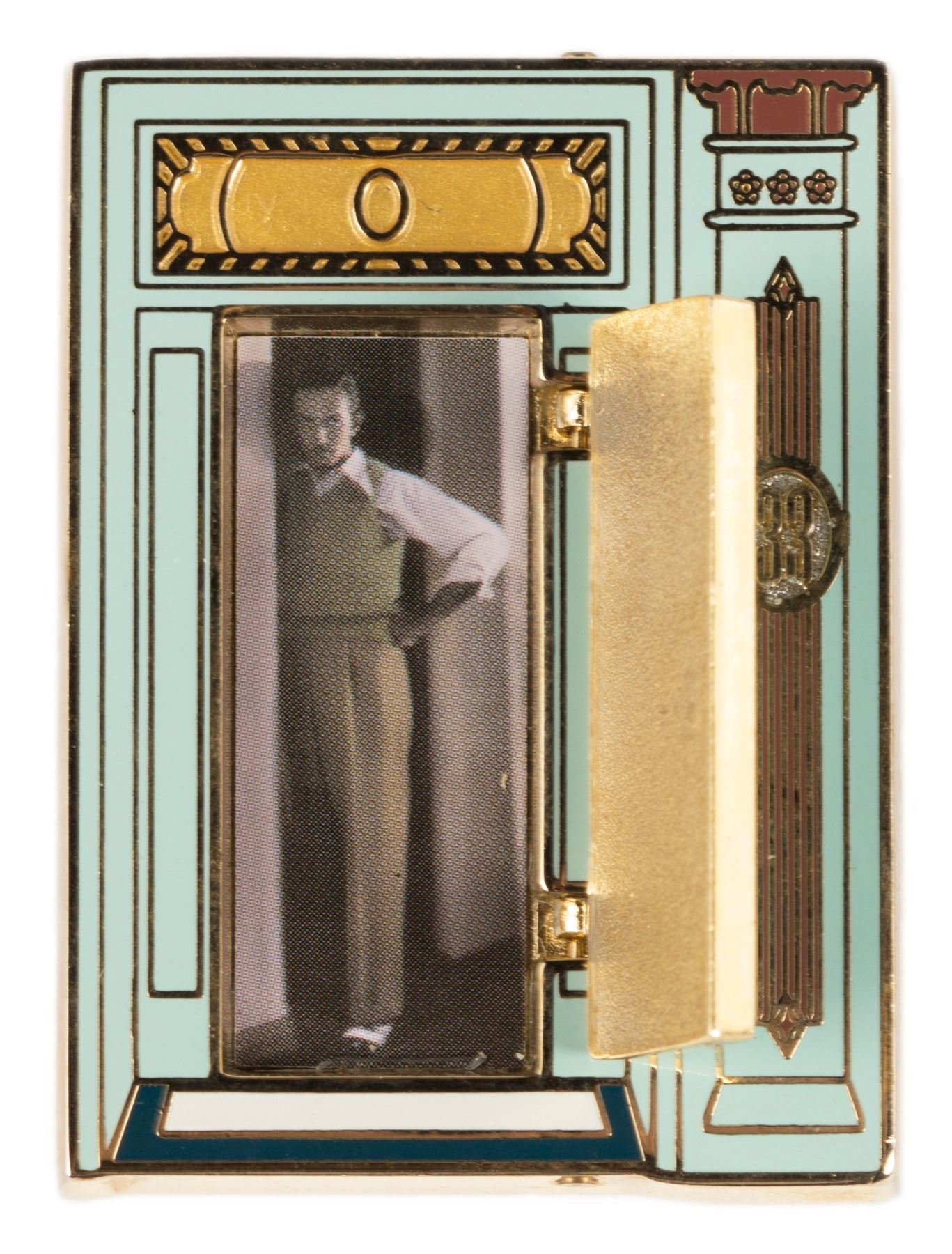 (Disneyland, 2003) A limited edition pin featuring imagery of the Club 33 entrance, with Walt Disney standing inside the doorway. This pin is the only Club 33 pin released to the general public, and it caused such upset among Club 33 members that Disney released an apology pin strictly to club members the following year. Measuring 1.75"x1.25", the pin is in very good condition with minor surface wear. The small doorknob is missing.