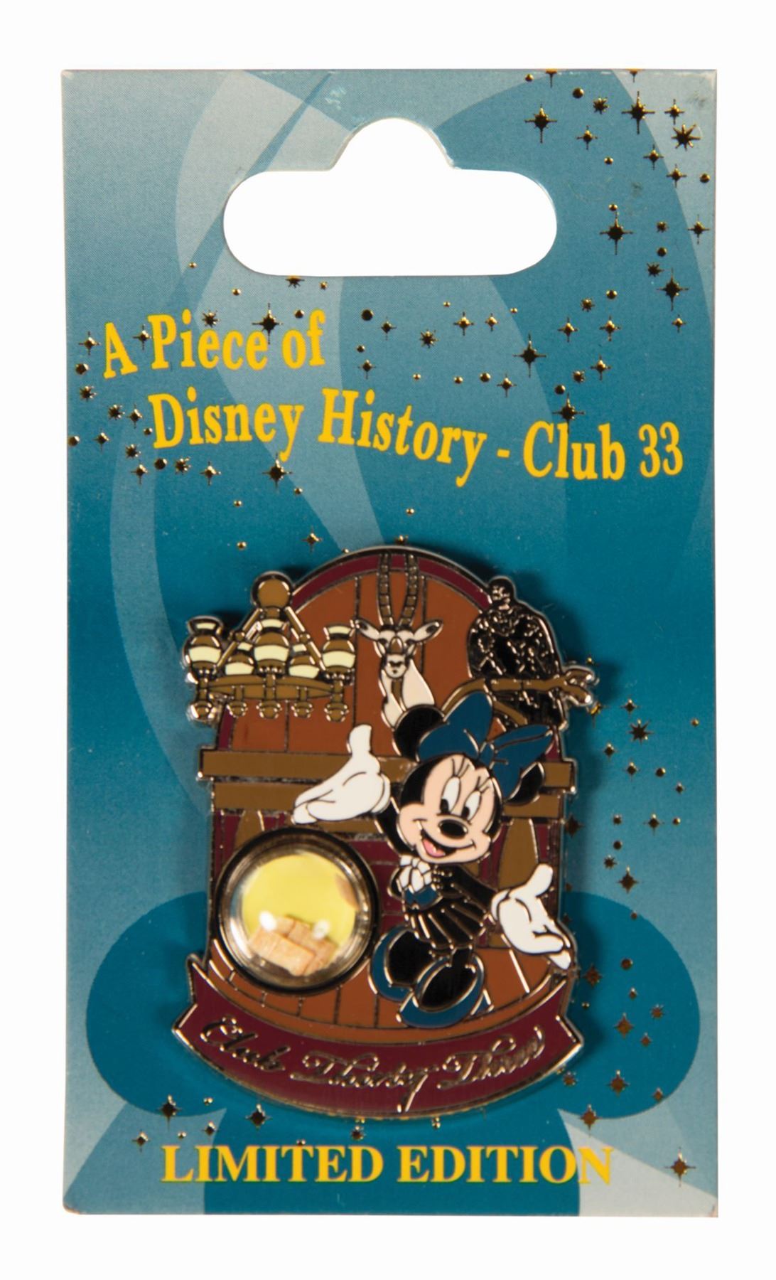(Disneyland, 2015) A limited edition enamel pin to commemorate the renovation of Club 33. Depicting Minnie Mouse in the original trophy-lined dining room, the pin features encapsulated remnants of the club's cypress wood paneling gleaned during the remodeling process. Measuring 1.75"x1.25", the pin is in fine condition and presented on its original backing card.