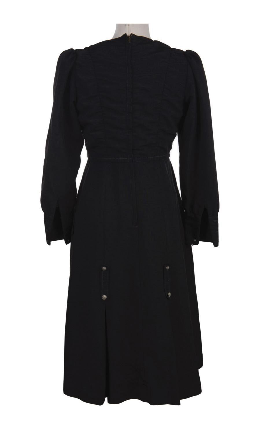 (Disneyland, 2000s) A fanciful server dress and dickey manufactured for staff of Club 33 at Disneyland. The French style ensemble is embellished with a floral embroidered dickey and Club 33 logo on the sleeve. Measuring a size 10, the wardrobe displays in very good condition, missing few buttons, retaining original Disneyland labels.