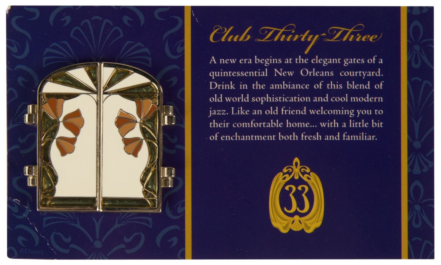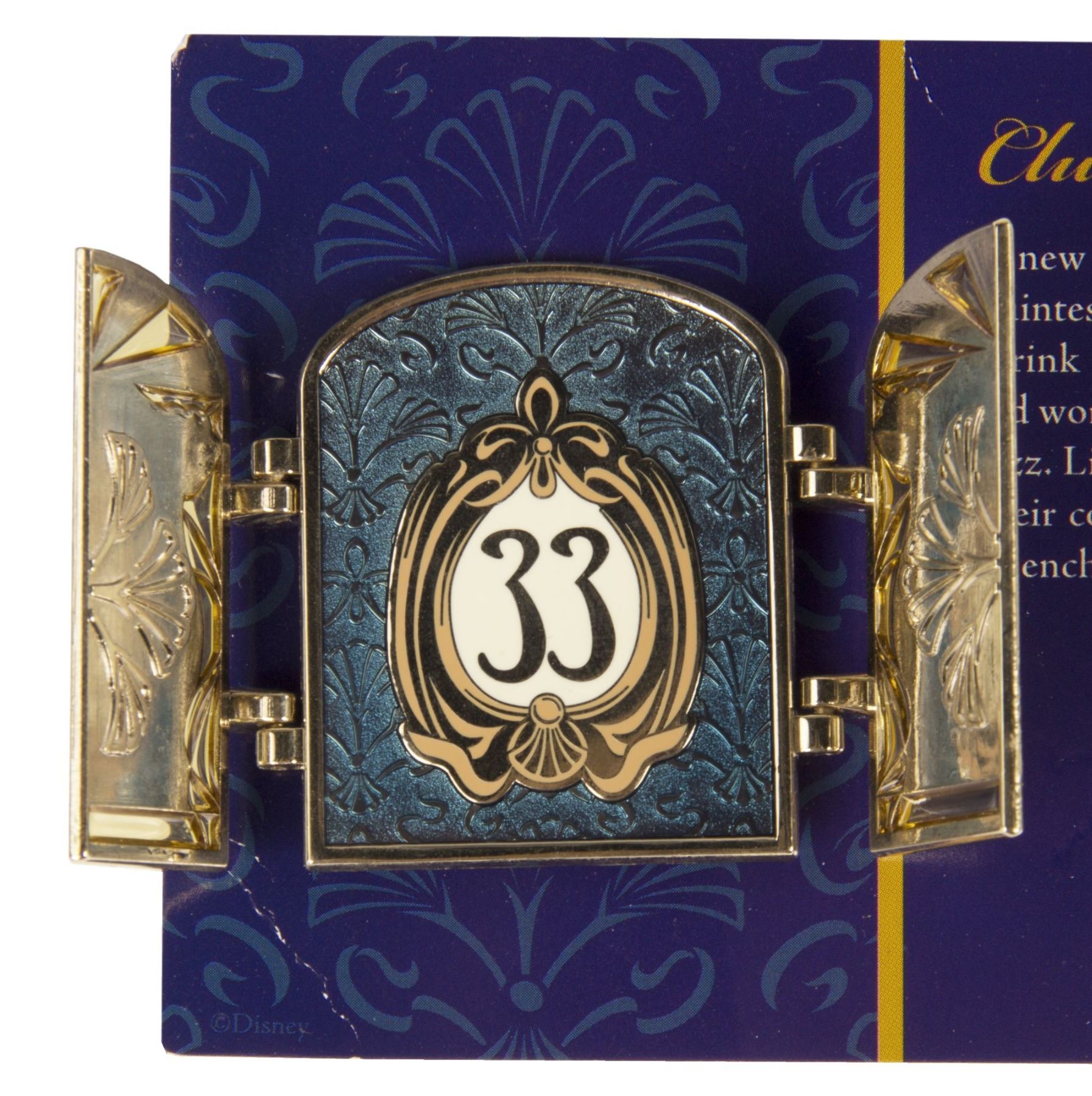 (Disneyland, 2014) A limited edition Club 33 exclusive pin depicting the Club's new stained glass doors with floral imagery. The pin opens to reveal a white and gold Club 33 logo on a decorative blue background. Measuring 1.75"x1.5", the pin is in very good condition and comes on its original Club 33 backing card.