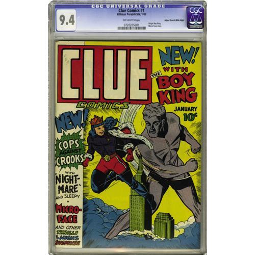 <B>Clue Comics #1 Mile High pedigree (Hillman Publications, 1943) CGC NM 9.4 Off-white pages.</B></I> Hillman brought out a whole new lineup of characters to populate this new title. Heading the list are the Boy King (king of a European nation, assisted by his stone giant pal) and Micro-Face (no, not a guy with a tiny face, but a fellow with a microphone in his mask). Also debuting are Nightmare and Sleepy, Twilight, and Zippo. No copy of this issue has been graded higher by CGC to date. Overstreet 2006 NM- 9.2 value = $1,850. CGC census 7/06: 1 in 9.4, none higher. <BR><BR><B>Important notice:</B> Heritage usually auctions material at the rate of 200-250 lots per hour. On some occasions eBay Live bid software or the Internet may not be able to keep up with the pace of the auction. We recommend placing a realistic absentee bid now as insurance to avoid disappointment. Occasionally the auctioneer may eliminate or reject an eBay Live bid, and the auctioneer may also reopen a lot after the close of the eBay live bidding (usually because we missed an audience bid), and may reject your bid even if it shows you as the winning bidder. By bidding via eBay Live, you agree that Heritage may award the lot to another bidder at its sole discretion under the circumstances described above or any other reasonable circumstances. Since eBay bids are not shown to us until we open the lot on the floor, we treat those bids just like floor bids. In most cases the floor responds before the eBay bid is presented to us, due to Internet lag time, so for consistency we have made it a policy that floor bids are always considered first over tie eBay live bids. Also please note that all Heritage lots purchased through eBay Live carry a 22.5% Buyer's Premium. Please make sure you read the Terms and Conditions before you bid. This lot is being auctioned in conjunction with a live floor auction by Heritage Auction Galleries. All final auction and invoice information will be supplied by Heritage Auction Galleries, and all other information should be considered preliminary. Lot:41001 <BR><BR><B>Winning Notification and Billing:</B> After the FINAL session in this auction is complete, Heritage will send e-mail and snail mail invoices. This process normally takes several days. All final auction and invoice information will be supplied by Heritage Auction Galleries, and all other information should be considered preliminary. <BR><BR>This auction will be conducted on a live auction floor and over the Internet through eBay Live. If you choose to place an absentee bid, please take a moment to <font color='#0000ff'><u><a href='http://pages.ebay.com/liveauctions/help/before/laabsentee.html'>learn how eBay Live absentee bidding works</a></u></font><font color='#000000'>
