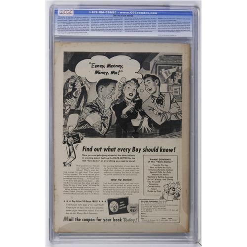 This issue marked a major turning point in the series, as Hillman editor Ed Cronin brought in comics' all-time best creative dynamos, Simon and Kirby, to lend their special pizzazz to the series! The story "King of the Bank Robbers" in this issue was their first contribution and marked the title's change to a true-crime book. While S&K didn't work on the cover, the image is a remarkable one in its own right. Overstreet 2006 FN 6.0 value = $150; VF 8.0 value = $305. CGC census 12/06: 1 in 7.0, 1 higher. <I>From the Crippen Collection.</B></I><BR><BR><b>Shipping:</b> Slabbed Comic (<a target="_blank" href="http://www.heritageauctions.com/common/shipping.php">view shipping information</a>)
