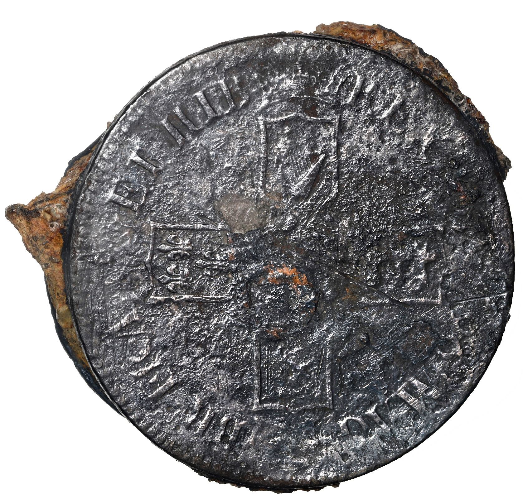Clump of one Lima, Peru, cob 8 reales, 1694 M, and one English crown, 1696, in matrix, as found.