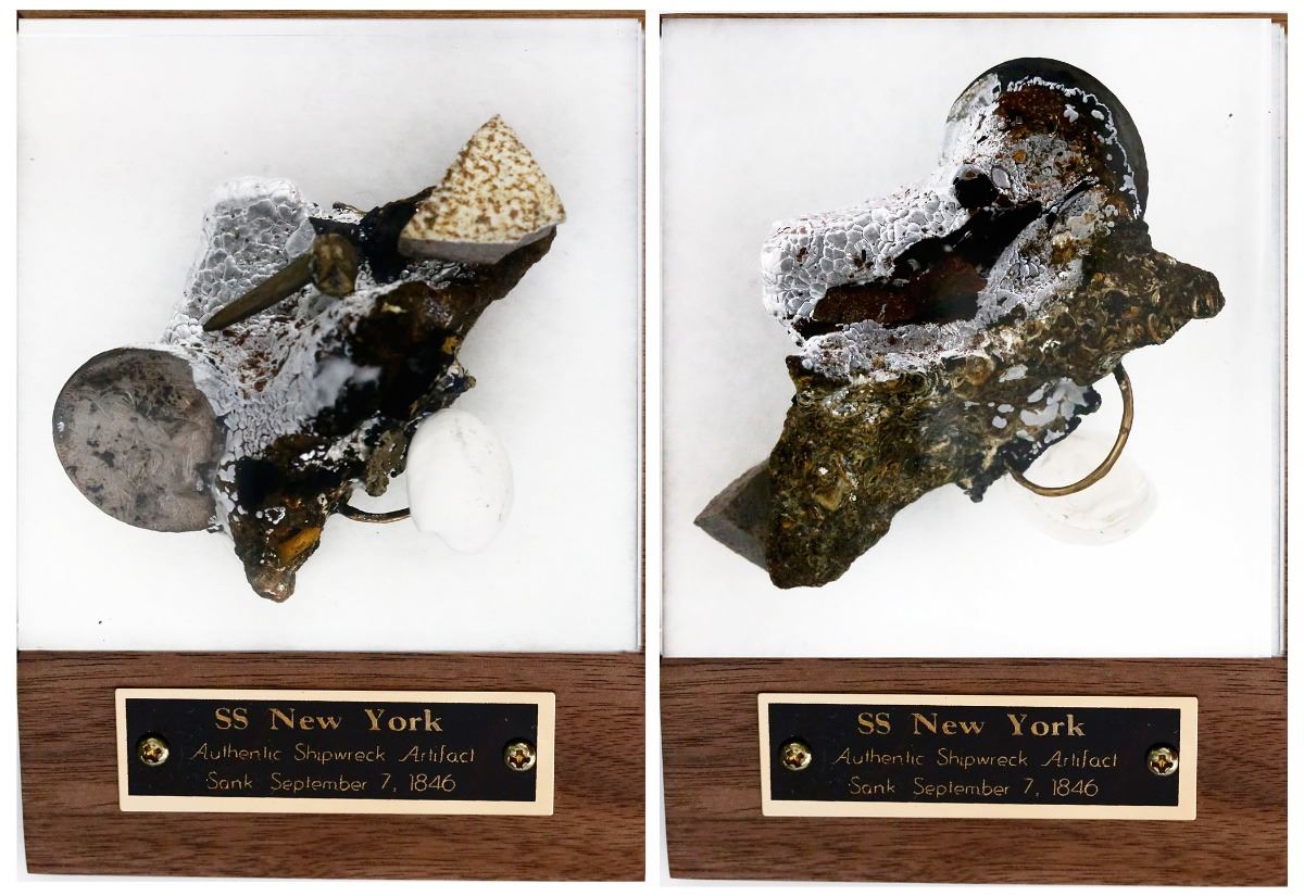 Clump of one coin and several small artifacts (USA 50c seated Liberty 1843, brass tack and ring, shell and earthenware shard), encased in Lucite. 524 grams, 3-1/2" x 3-1/2" x 2". The coin looks intact, with bold date on exposed side, embedded in a gray/orange/black conglomerate that also contains a thin ring, the earthenware shard (looks like bellarmine) and tack and shell just floating around the clump inside the Lucite, nice display (note the accompaniments). Pedigreed to the original SS New York auction (Stack's, July 2009), with original lot-tag #1087, with certificate, box and stand with plaque showing wreck details. Recoverd from: SS New York, sunk in 1846 in the Gulf of Mexico