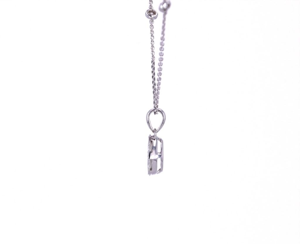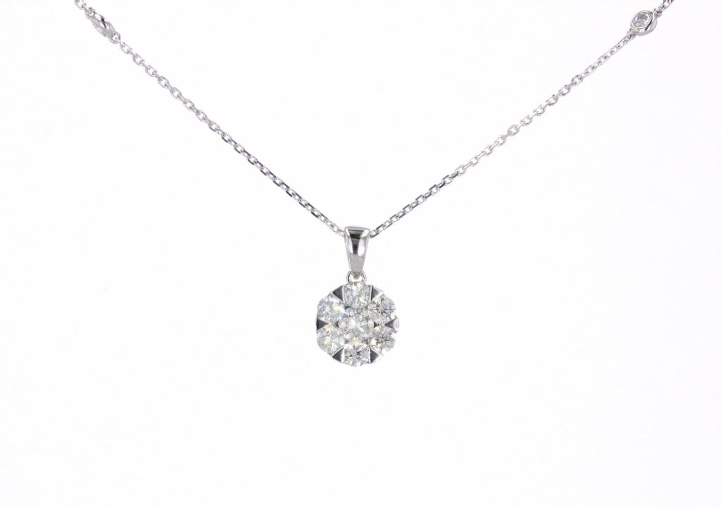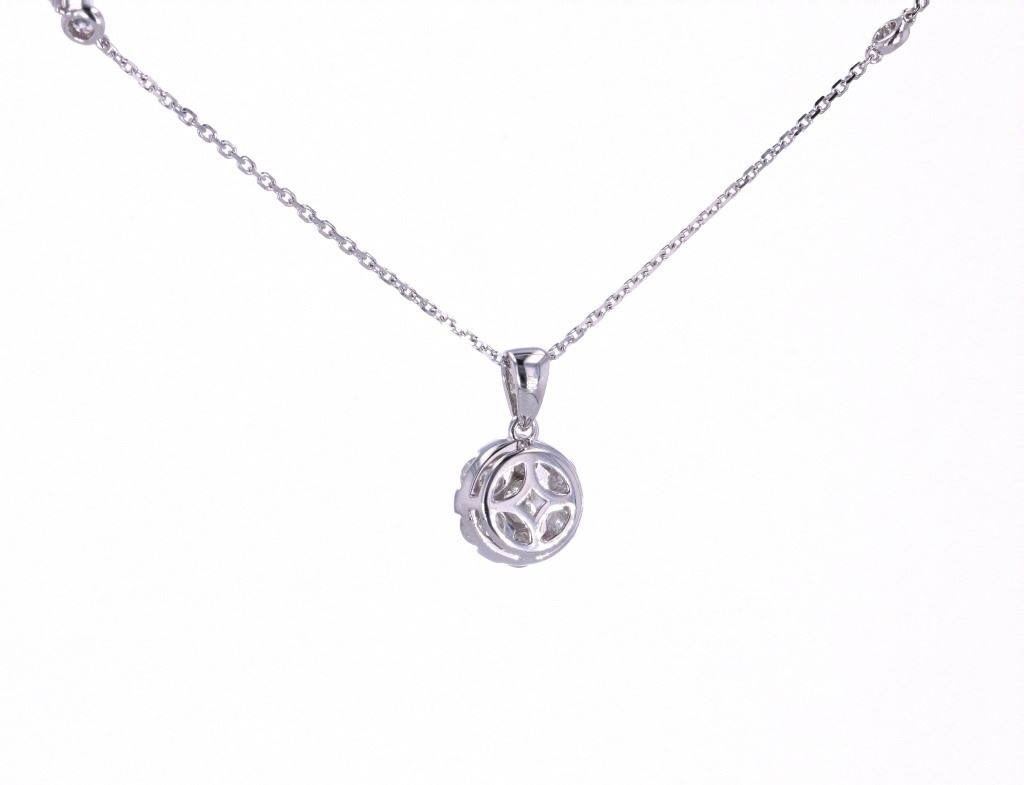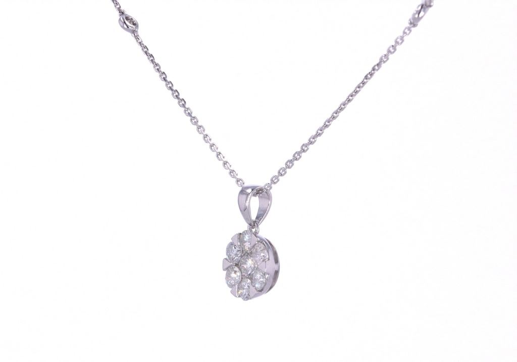 Featured in this lot is this cluster diamond and 14k white gold necklace. The necklace and chain is professionally crafted from 14k white gold with a total gold weight of 2.55 GM. The necklace shows a unique cluster design around a single round brilliant cut diamond with a weight of 0.19 carats. There are a total of 8 round brilliant cut diamonds featuring a weight of 0.61 carats. The measurement from clasp to clasp is 18".