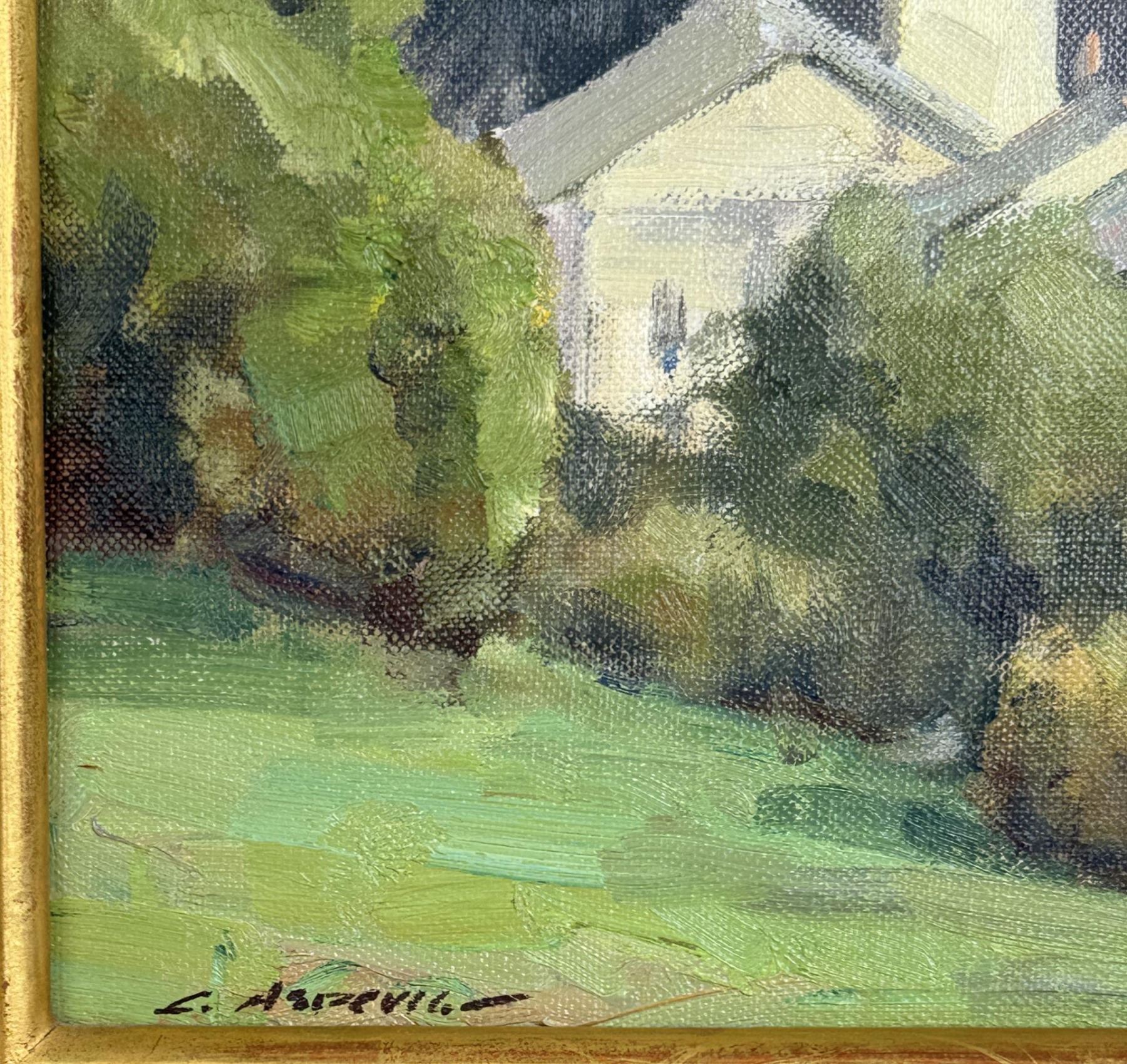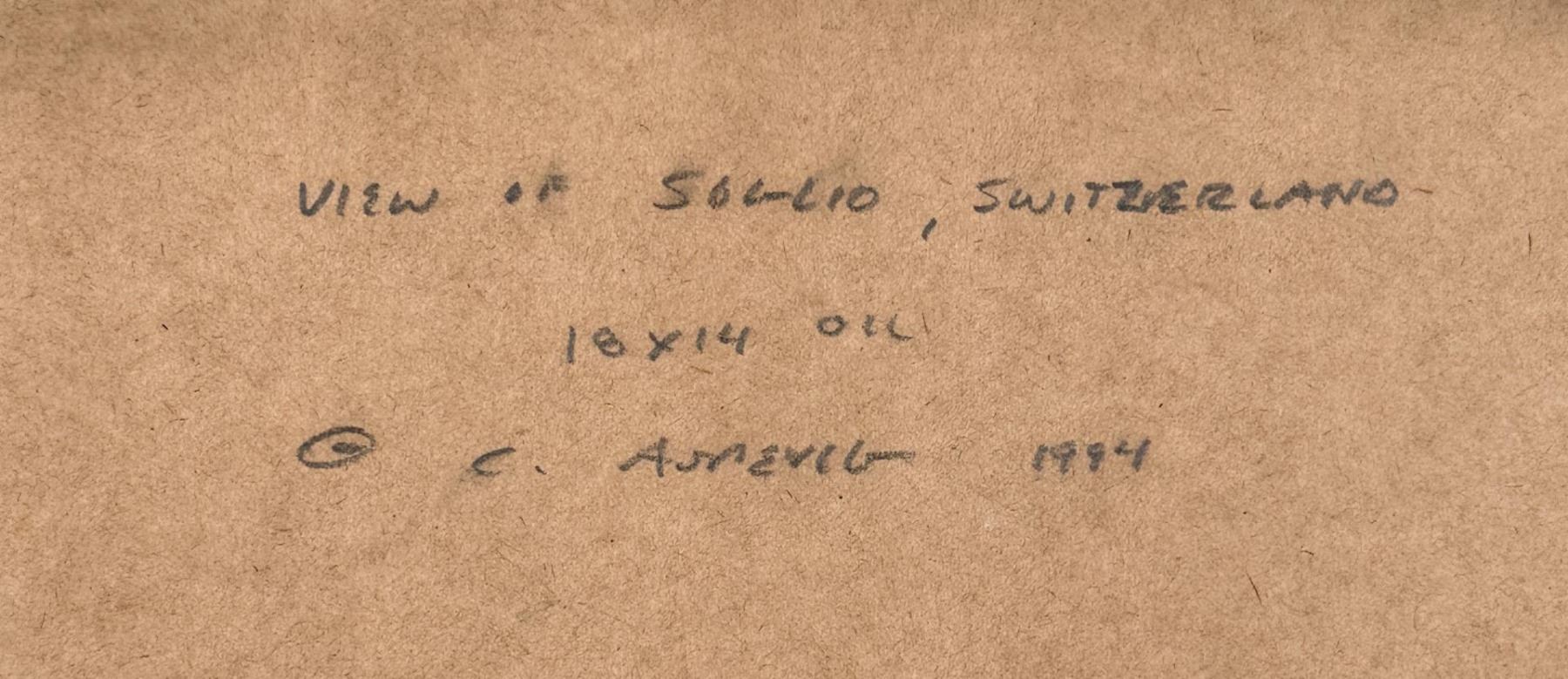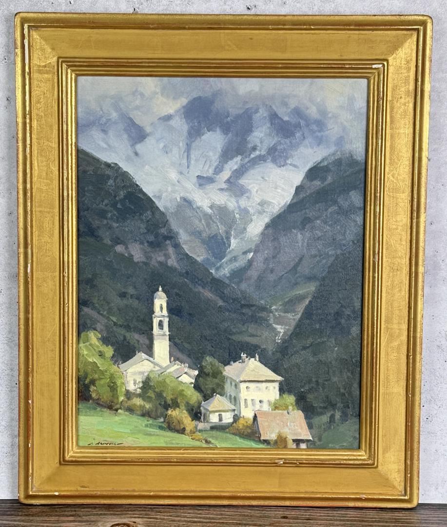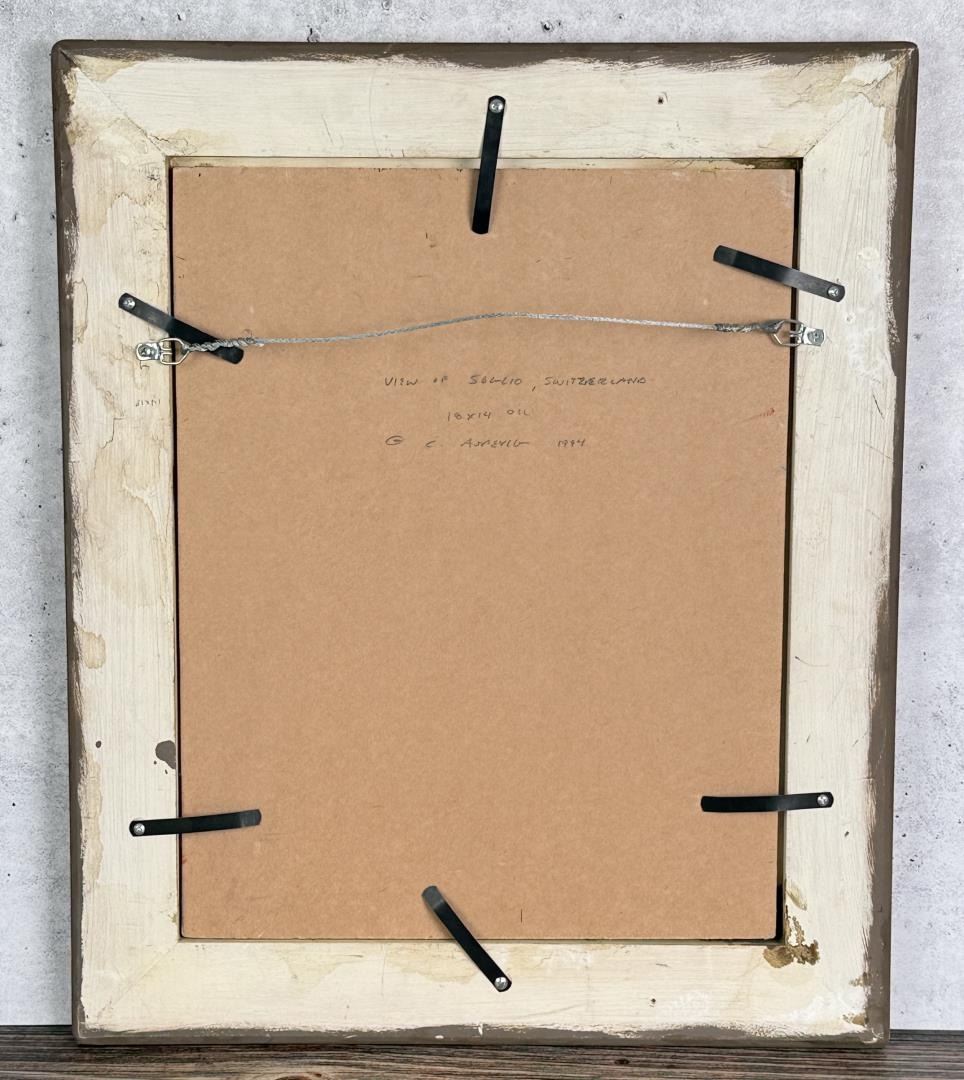 Title is Street in Soglio Switzerland. 14" by 18" unframed. 19 1/4" by 23 1/4" framed. Oil on Board. Clyde Aspevig (Born 1951) is active/lives in Montana, Colorado. Clyde Aspevig is known for Mountain landscape and coastal view painting. Inspired by the sagebrush and wide open horizons of Wyoming and Montana, Clyde Aspevig is a landscape painter who does sketches on location and finishes the work in his studio. Although he was trained to be an art educator, he has had little formal training as a painter, but has studied the work of artists he much admires including John Singer Sargent, Anders Zorn, and Winslow Homer. His obvious talent has won him prestigious recognition including the Frederic Remington Award and the Robert M. Lougheed Memorial Award, both from the National Cowboy Hall of Fame. He is a member of the Northwest Rendezvous Group, and is the first Montana artist since Charlie Russell to exhibit at Grand Central Art Galleries* in New York City. Aspevig was born in Rudyard, Montana, and raised on a small working wheat farm near the Canadian border. He became mindful of people's reliance upon the land, although he left the farm to attend Eastern Montana College in Billings. However, he dropped out to spend the winter in the Bear Paw Mountains and then returned for a degree in art education. He taught for one year in Sandy Oregon High School and then went back to Montana with his wife, artist Carol Guzman, to paint full time. From 1988, the couple has lived in Loveland, Colorado where he remodeled an historic church for his studio. Aspevig travels widely to paint, choosing landscape subjects in the Southwest and the West including along the Missouri and Yellowstone Rivers, and in foreign places such as England, Italy and the Caribbean.