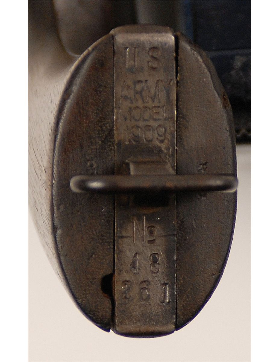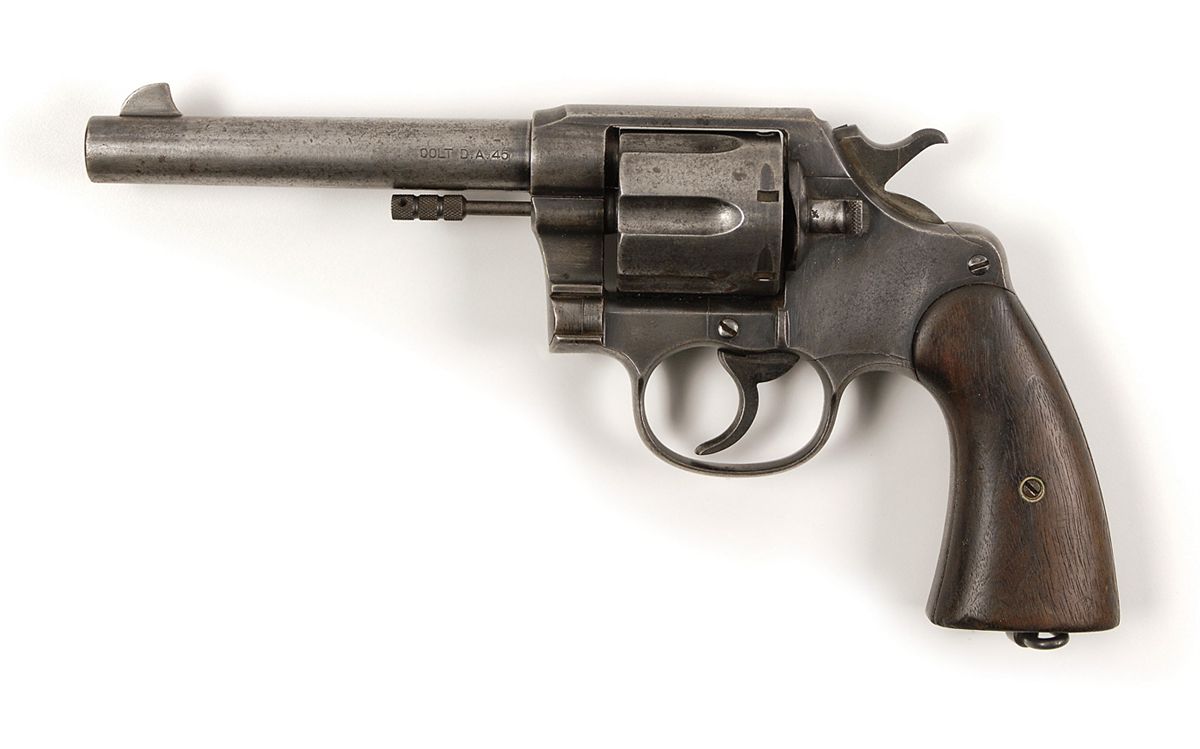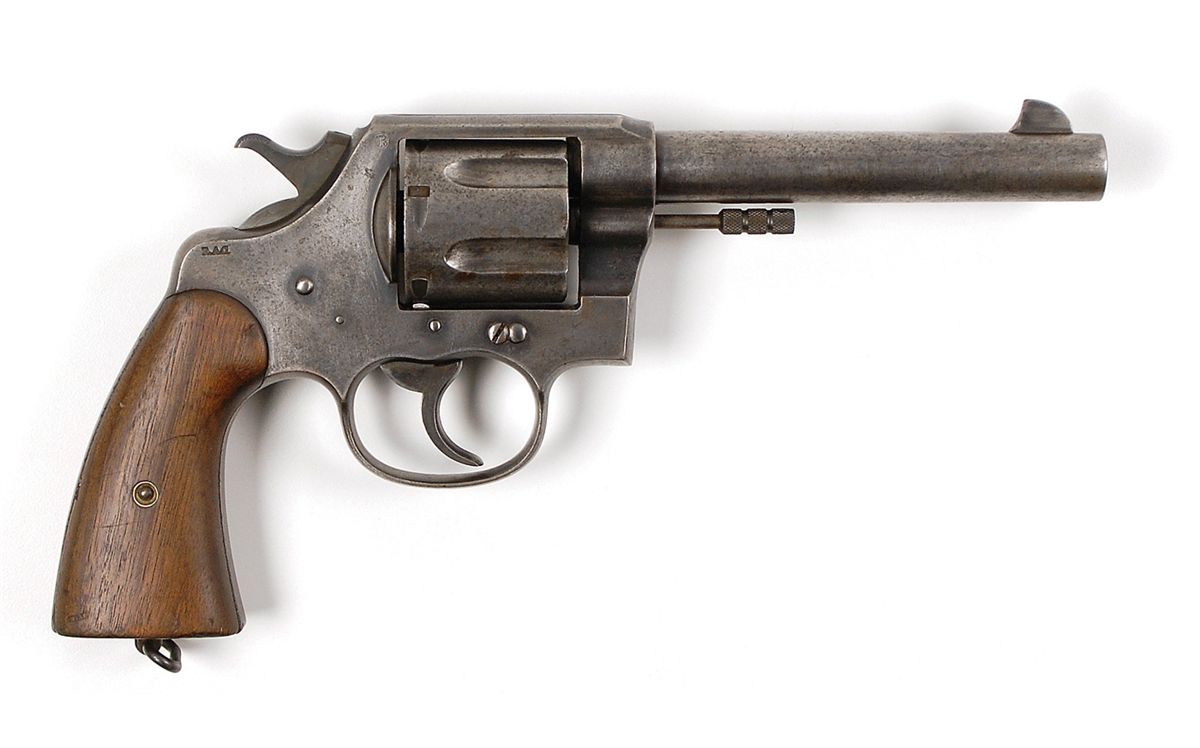 A Colt New Service Model 1909 Double-Action revolver found in the bullet-riddled car driven by Bonnie and Clyde on the day they died. This revolver comes with a Colt Factory letter indicating it was shipped on August 12, 1911, to the US Ordnance Department in Manila, Philippine Islands. It is marked on the butt with “U.S./ Army/Model/1909/No. 148/261” and is a .45 Colt caliber gun with a 5.5? barrel. The frame is marked with a monogramed circular government inspector’s cartouche plus the government inspector’s initials “R.A.C.” (Rinaldo A. Carr). The revolver is in very good mechanical condition with the metal having an overall gray patina with traces of blue and most of the factory markings are very good. The smooth walnut grips are in good condition and bear an “R.A.C.” inspection stamp on the butt.
