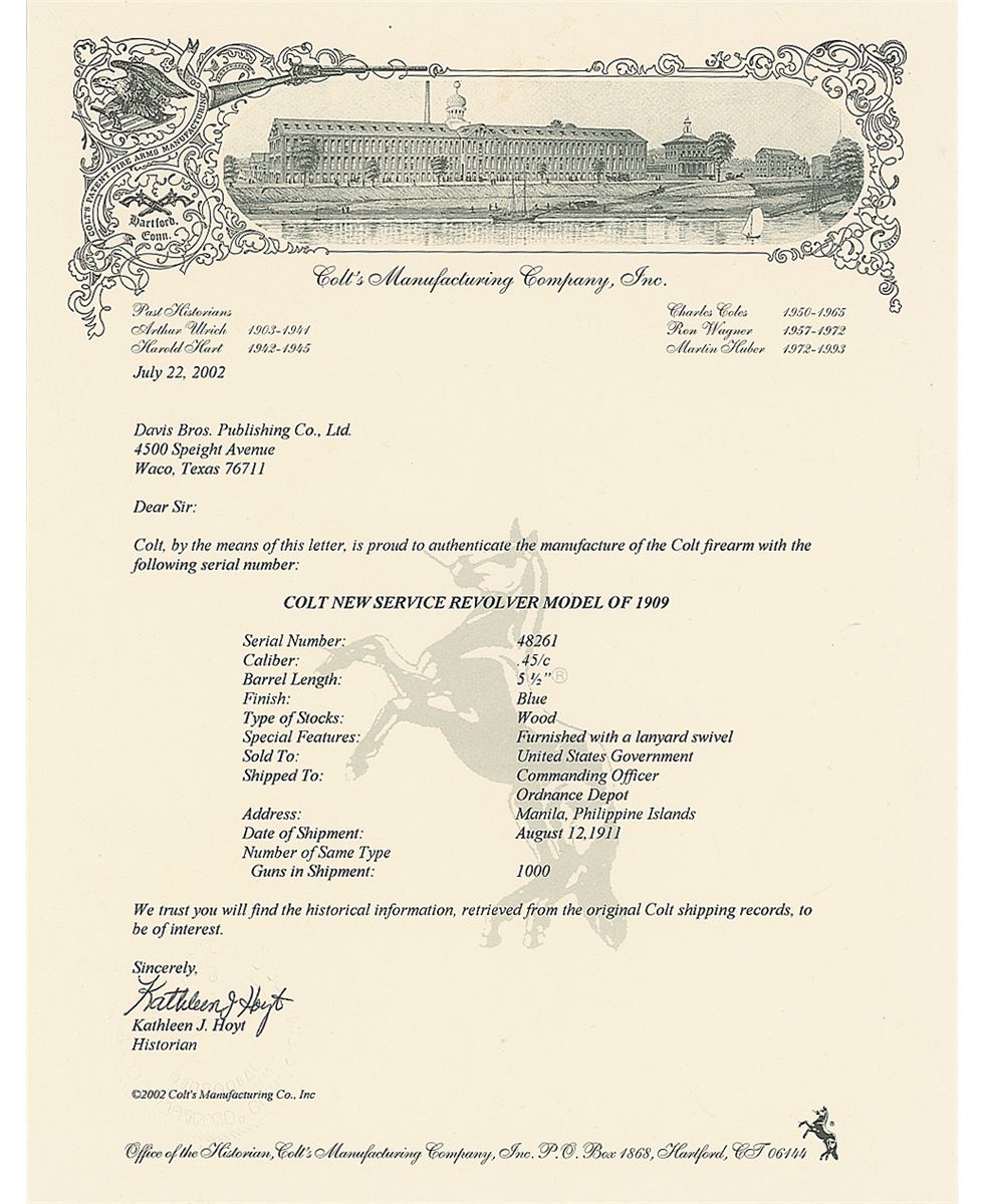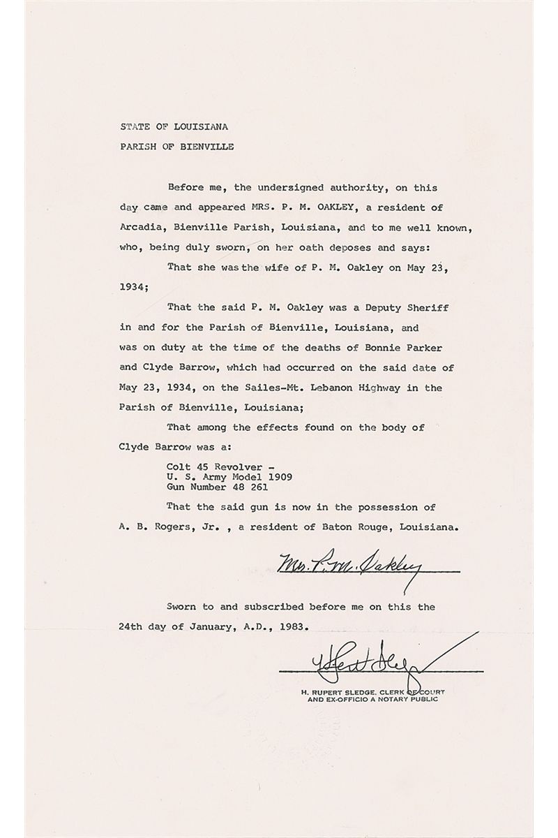 Included with the gun is a picture of A. B. Rogers, Sr., a Deputy Sheriff in and for the Parish of Bienville, Louisiana, who was on duty in the court house at the time of Bonnie and Clyde’s deaths. He is displaying some of the ammunition and guns found in their car. Among the items are this revolver, three Colt 1911 pistols, two BARs, one cut down Remington Model 11 semi-auto shotgun, and numerous BAR and pistol magazines with extra ammunition. A letter from his daughter-in-law dated February 28, 2002, states that A. B. Rogers, Sr., was given this 1909 Colt at the time of the photograph. Also included is a notarized letter dated January 24, 1983, from Mrs. P. M. Oakley (the widow of Bienville Parish Deputy Sheriff Prentiss Oakley who fired the first shots in the ambush of Bonnie and Clyde). In this letter she states that her husband was on duty at the time of Bonnie and Clyde’s deaths and “that among the effects found on the body of Clyde Barrow was a: Colt 45 Revolver/U. S. Army Model 1909/ Gun Number 148 261. That said gun is now in the possession of A. B. Rogers, Jr., a resident of Baton Rouge, Louisiana.” Note that Mrs. Oakley’s 50-year-old recollection that this revolver was on Clyde’s body cannot be substantiated at this time, but it is readily visible among the weapons taken from the “death car.”