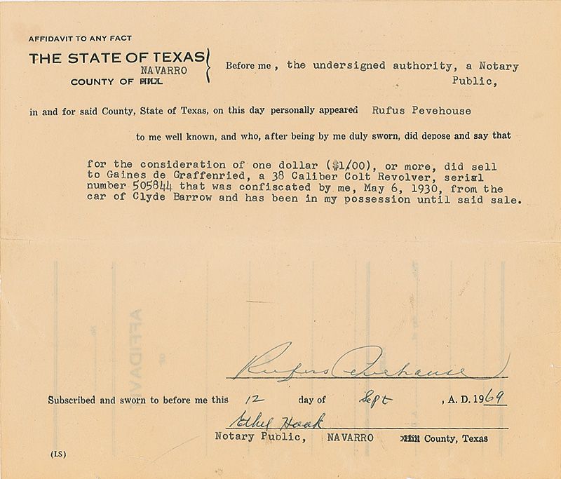 2) A notarized affidavit to any fact, dated September 12, 1969, and signed by Rufus Pevehouse in which he sold this revolver to noted Texas gun collector Gaines de Graffenreid. He mentions the gun by serial number and states “serial number 505844, that was confiscated by me, May 6, 1930, from the car of Clyde Barrow and has been in my possession until said sale.”