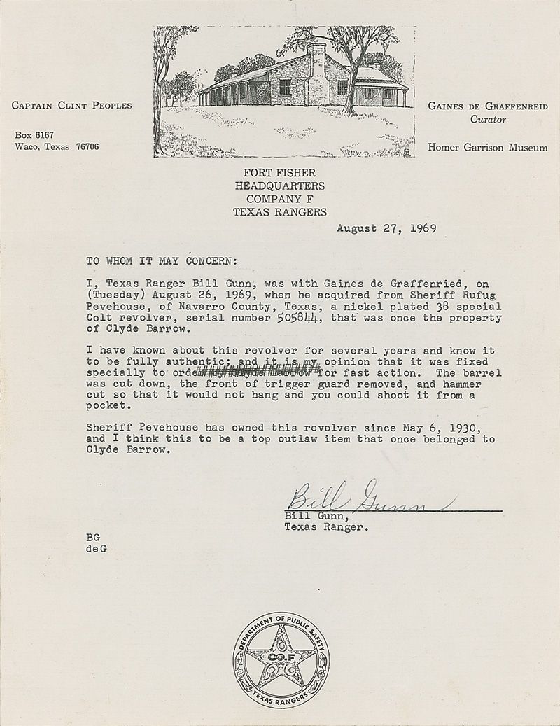 3) A signed statement by Bill Gunn, Texas Ranger, on the letterhead of Fort Fisher Headquarters, Company F, Texas Rangers (the Texas Rangers Garrison Museum). He states that he was with Gaines de Graffenreid when he acquired this gun from Sheriff Pevehouse on August 26, 1969. He mentions the gun by serial number “that was once the property of Clyde Barrow,” and that “I have known about this revolver for several years and know it to be fully authentic…Sheriff Pevehouse has owned this revolver since May 6, 1930, and I think this to be a top outlaw item that once belonged to Clyde Barrow.” This Colt was sold at auction in 2001 by Christie's.