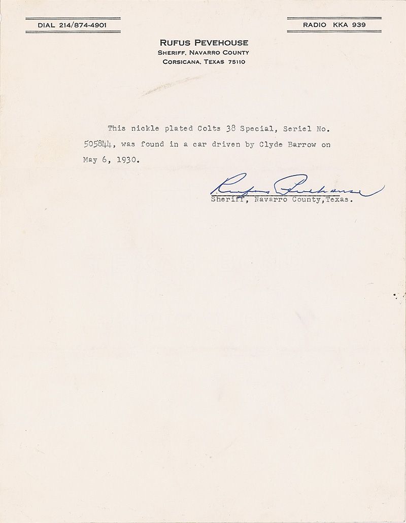 1) An undated statement on the letterhead of “Rufus Pevehouse, Sheriff, Navarro County, Corsicana, Texas, 75110” which reads, “This nickle plated Colts 38 Special, Serial No. 505844, was found in a car driven by Clyde Barrow on May 6, 1930.” Signed “Rufus Pevehouse, Sheriff, Navarro County, Texas.”