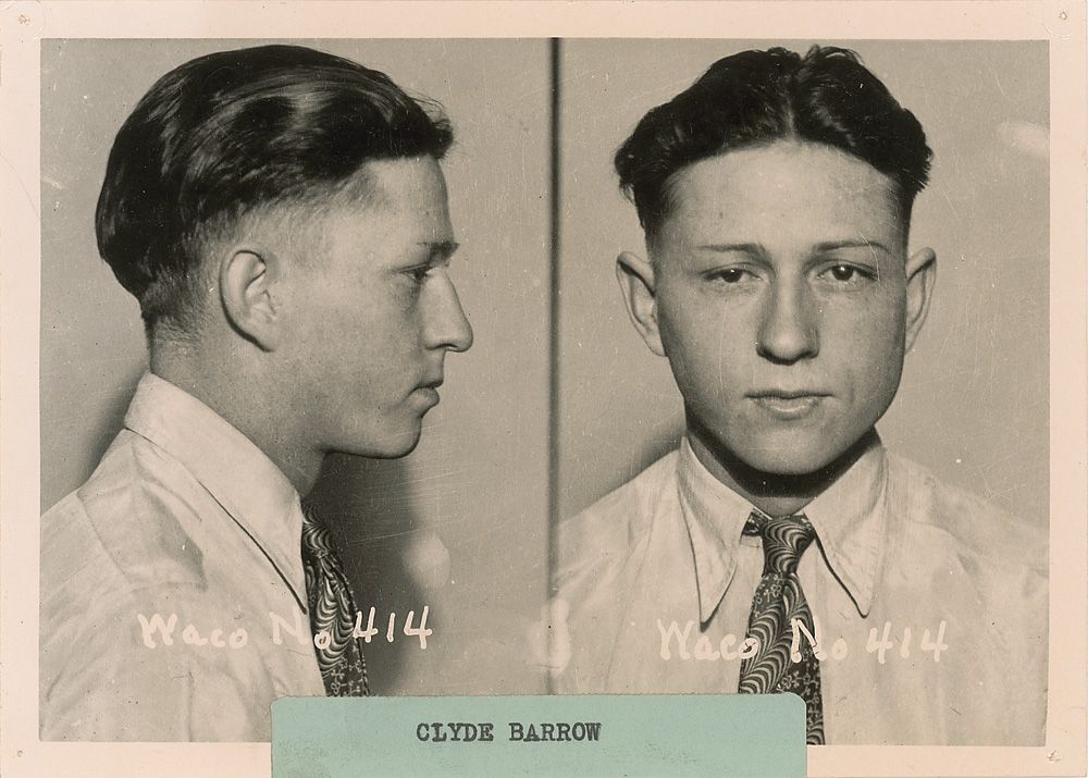Vintage 1930s 7 x 5 gelatin silver mug shot photograph of Clyde Barrow. Shots show Barrow head-on and in profile, and both are labeled Waco No. 414 in the photo. The images are clear and detailed. A typed caption is affixed to the bottom of the image. In very good condition, with a tack hole to each corner, scattered surface marks and creases, and light silvering to darker areas. This mug shot would be used in Barrow’s Joplin, Missouri, wanted poster.