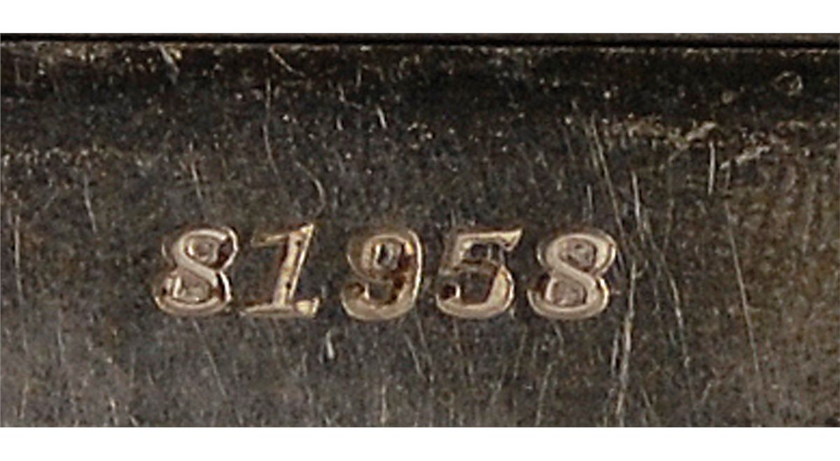This is a type II Colt Model 1908, serial number 81958, cal. .380 A.C.P. with a 3 ¾” barrel, factory nickel finish and non-factory mother-of-pearl grips. This Colt was made in 1924 and retains about 98% nickel finish with many hairline scratches and excellent factory markings. The mother-of-pearl grips show great color with a large chip missing on the right side at the screw escutcheon. The original factory magazine is nickel finished and is properly marked “CAL.380/COLT.” The mechanism functions well and the barrel has a very good bore. According to the included copy of a Colt factory letter stating this gun was shipped to Wolf and Klar of Fort Worth, Texas, on November 5, 1924.