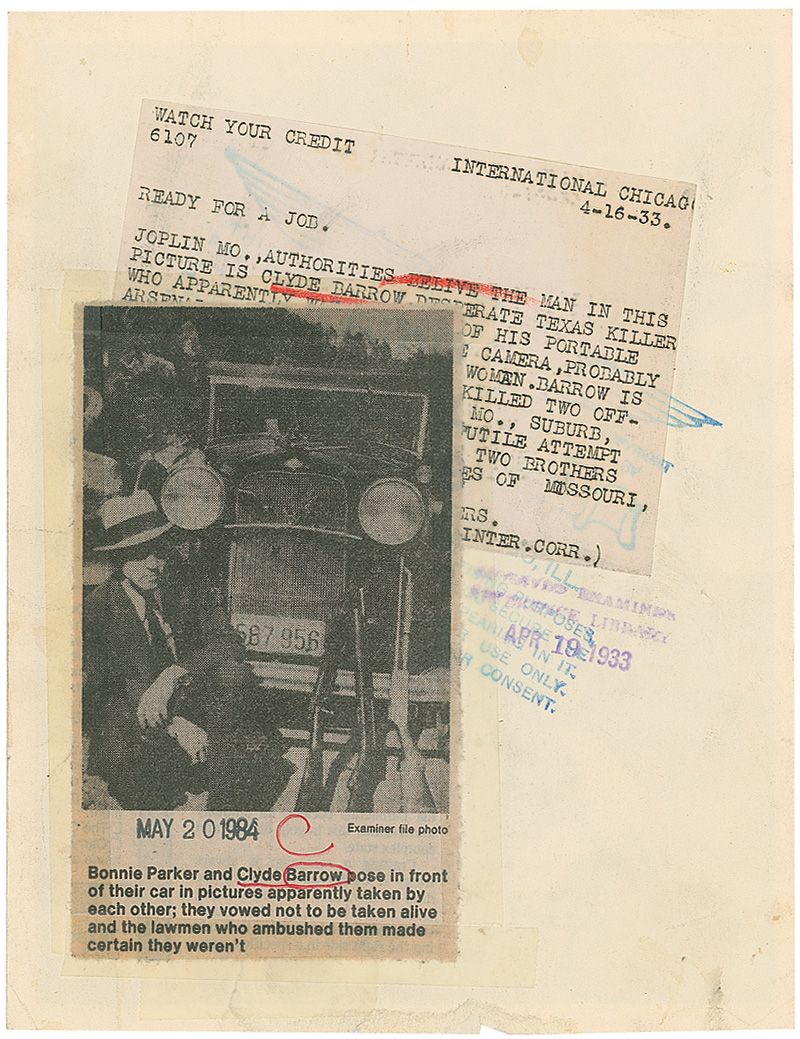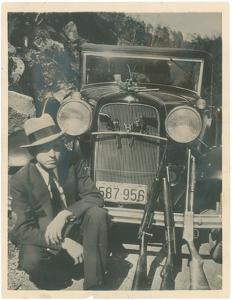 Original vintage 1933 7 x 9 inches news photo from the San Francisco Examiner's archives, showing a famous image of Clyde Barrow posing in front of his beloved V8 Ford, with a rifle and two shotguns leaning against the front, two revolvers tucked into the grill and one hanging from the hood ornament. The back includes the original news service stamp and paper caption, and the Examiner's stamp with 1933 date. A few edge and corner creases and light discoloration to center of image, otherwise fine condition. A classic photograph and one of the better known images of Clyde.