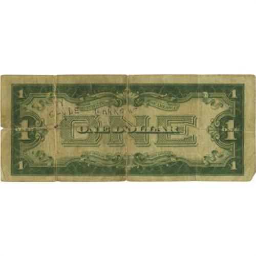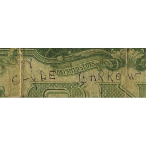 <B>Clyde Barrow Signature on a 1928 One Dollar</B></I> silver certificate together with the signatures of Dallas County Sheriff "<I>R. A. 'Smoot' Schmid</B></I>", and his deputies "<I>Ted Hinton</B></I>" and "<I>Bob Alcorn</B></I>", three members of the six officer posse who killed Barrow together with Bonnie Parker in a hail of bullets on May 23, 1934 in Louisiana. Barrow (1909-34), American gangster and founder of the "Bonnie and Clyde" gang, with Bonnie Parker he terrorized the Southwest for four years, robbing banks and stores and gunning-down thirteen civilians and lawmen along the way. A third member of the gang, Henry Methvin, tired of his life on the run, betrayed the duo to Texas Ranger Frank Hamer and plans were made to trap the pair. On May 23, 1934 Hamer and his Rangers prepared an ambush at Gibland, Louisiana and as Barrow and Parker passed in their car, they were riddled in a hail of gunfire. Barrow signs simply in print on the verso: "<I>By Clyde Barrow</B></I>". Schmid, Hinton and Alcorn have affixed their signatures to the recto dated May 23, 1934. This particular silver certificate was presented by one of the three to another Dallas County deputy sheriff as a souvenir. The certificate then passed to his daughter who has enclosed a letter of provenance. Certificate bears the usual folds, light soiling, but is in otherwise near fine condition. A remarkable association piece.<BR><BR><b>Shipping:</b> Small Flat (<a target="_blank" href="http://www.heritageauctions.com/common/shipping.php">view shipping information</a>)