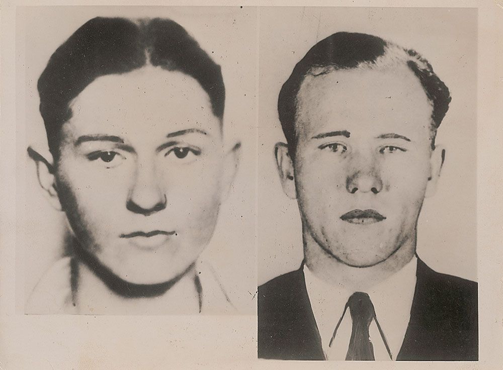 Vintage glossy 8 x 6 Acme Newspictures press photo bearing the mugshots of Clyde Barrow and Raymond Hamilton, with the original caption affixed to the reverse, dated January 17, 1934, with its headline reading, “Hunted after Texas prison break,” noting that Barrow is being sought in the break that freed Hamilton, who was serving a 263-year sentence. In fine condition, with mild edge rippling and a few creases.