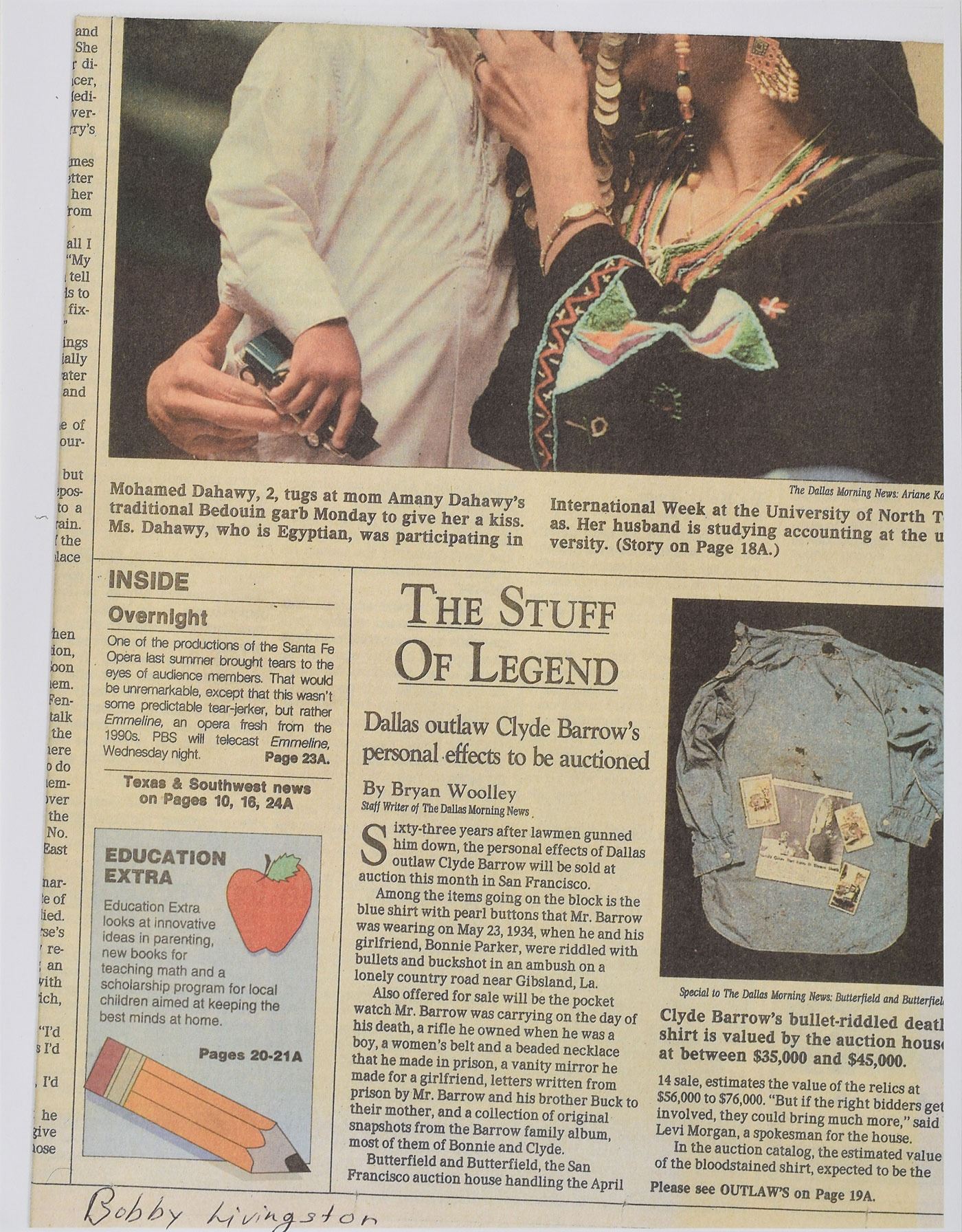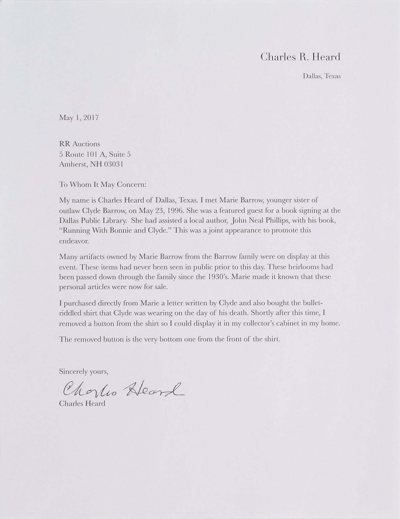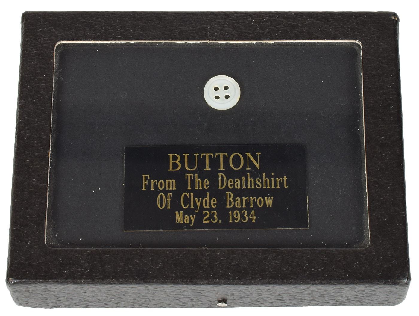 Off-white .5? button removed from the shirt Clyde Barrow was wearing when he and Bonnie Parker were shot and killed by officers in an ambush near Sailes, Bienville Parish, Louisiana, on May 23, 1934. In fine condition. Originally purchased from Clyde Barrow's younger sister, Marie, and is accompanied by a letter of provenance from the buyer, in part: "I met Marie Barrow, younger sister of outlaw Clyde Barrow, on May 23, 1996. She was a featured guest for a book signing at the Dallas Public Library...Many artifacts owned by Marie Barrow from the Barrow family were on display...Marie made it known that these personal articles were now for sale. I...bought the bullet-riddled shirt that Clyde was wearing on the day of his death. Shortly after this time, I removed a button from the shirt so I could display it in my collector's cabinet in my home. The removed button is the very bottom one from the front of the shirt." Also includes a few images of the shirt, including one of Marie Barrow holding it.