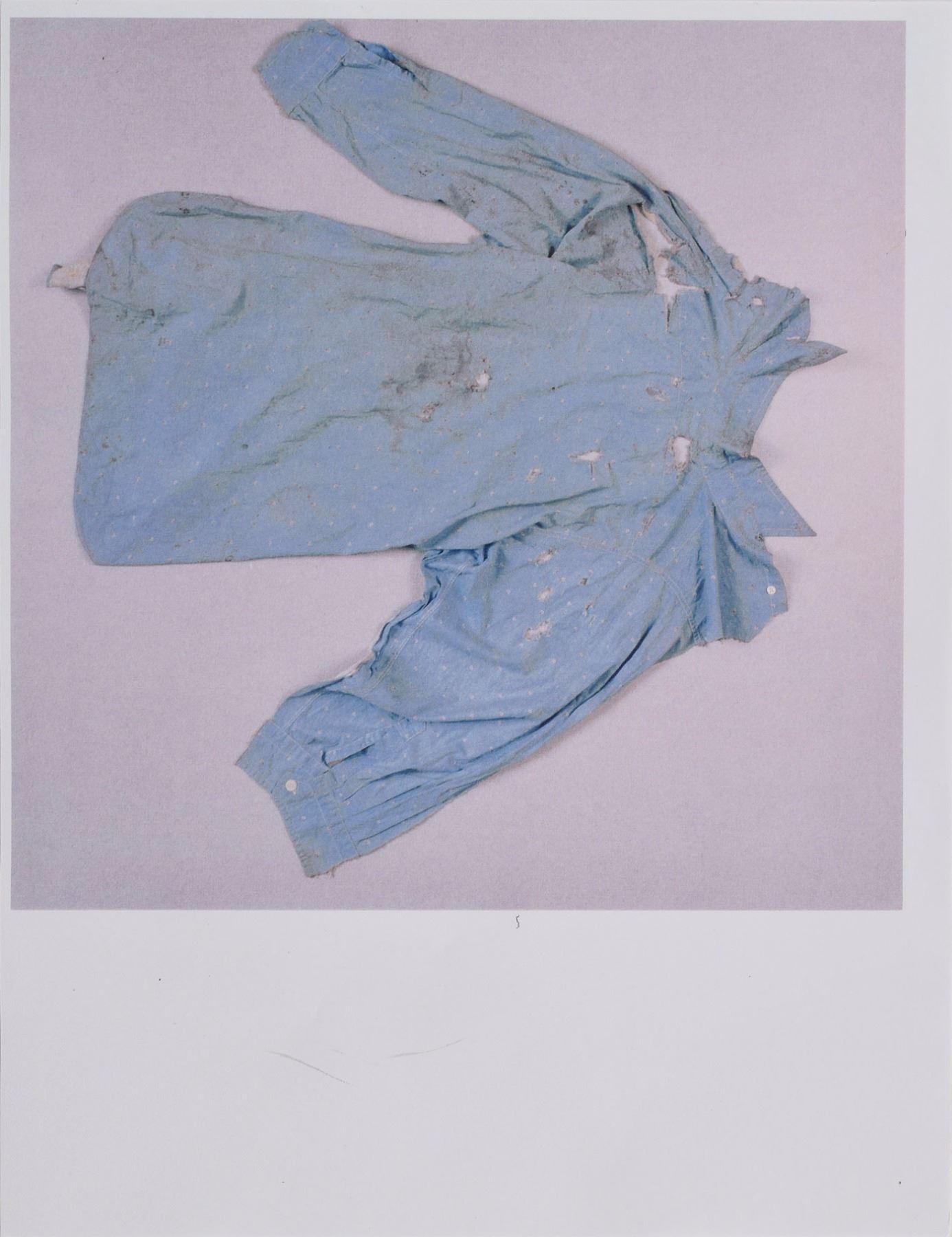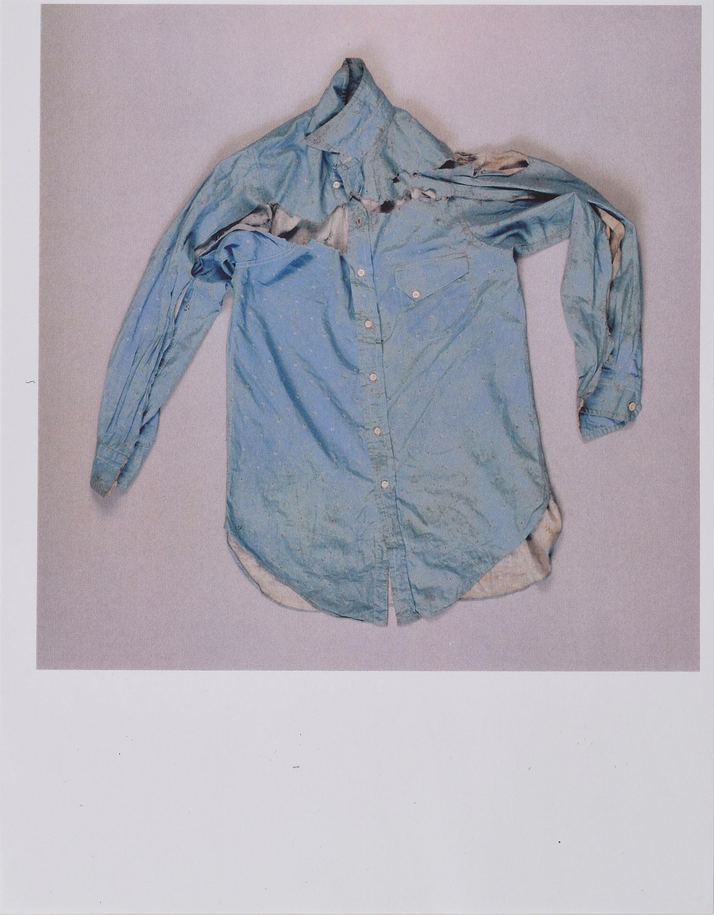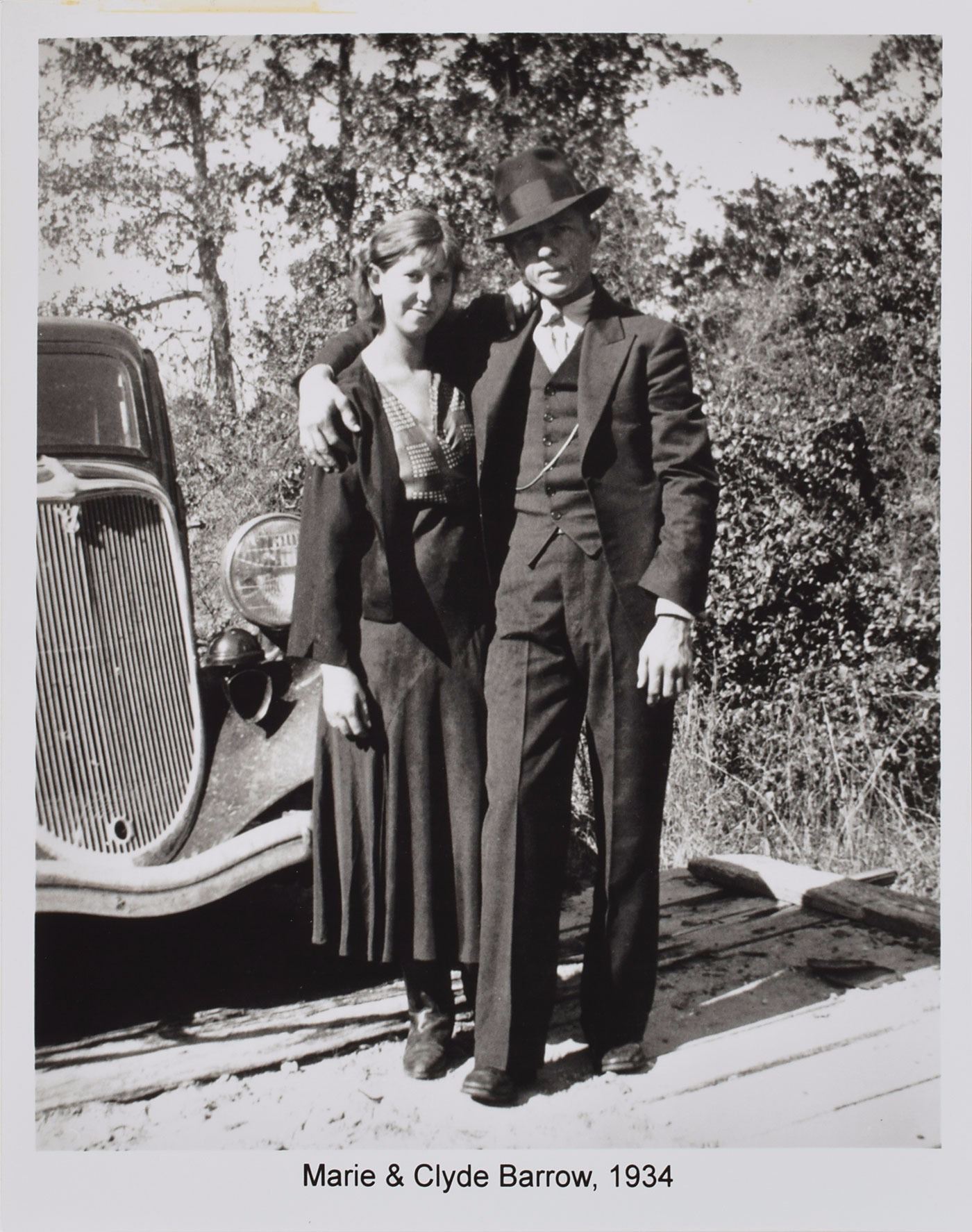 Off-white .5? button removed from the shirt Clyde Barrow was wearing when he and Bonnie Parker were shot and killed by officers in an ambush near Sailes, Bienville Parish, Louisiana, on May 23, 1934. In fine condition. Originally purchased from Clyde Barrow's younger sister, Marie, and is accompanied by a letter of provenance from the buyer, in part: "I met Marie Barrow, younger sister of outlaw Clyde Barrow, on May 23, 1996. She was a featured guest for a book signing at the Dallas Public Library...Many artifacts owned by Marie Barrow from the Barrow family were on display...Marie made it known that these personal articles were now for sale. I...bought the bullet-riddled shirt that Clyde was wearing on the day of his death. Shortly after this time, I removed a button from the shirt so I could display it in my collector's cabinet in my home. The removed button is the very bottom one from the front of the shirt." Also includes a few images of the shirt, including one of Marie Barrow holding it.