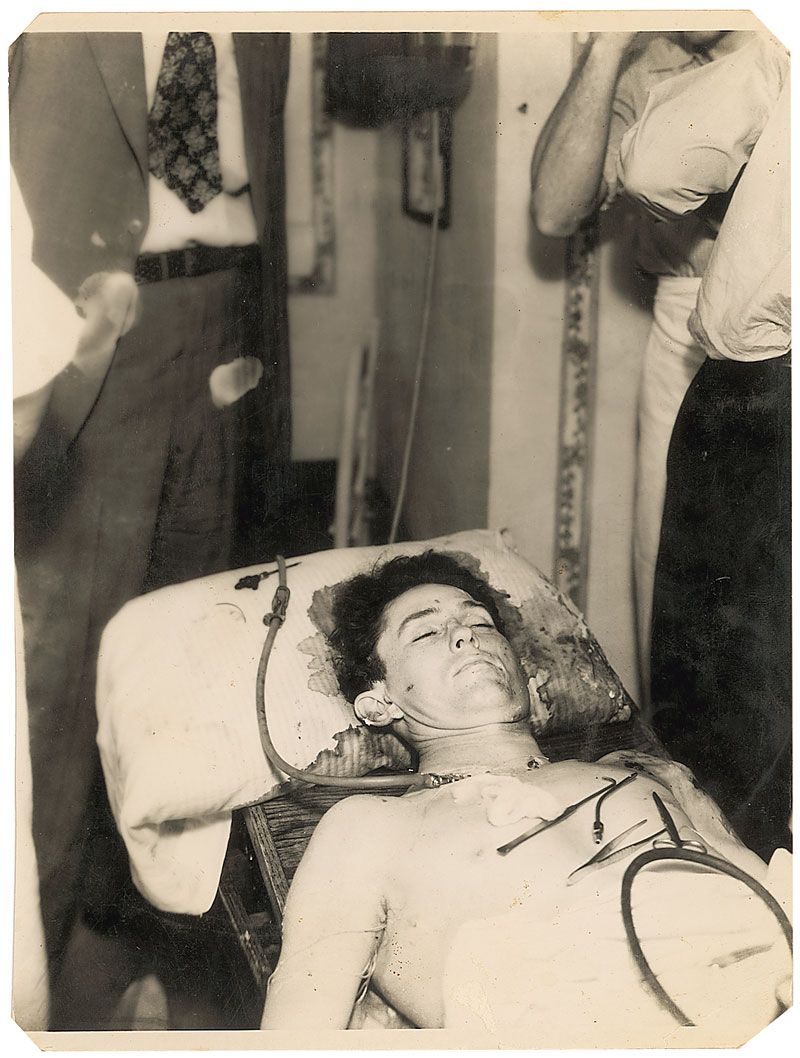 Original vintage first generation 7.25 x 10 semi-glossy photo of Clyde Barrow at the undertaker’s in the midst of the embalming process, his head resting on a blood-soaked pillow. In fine condition, with clipped corner tips and slightly trimmed vertical edges.