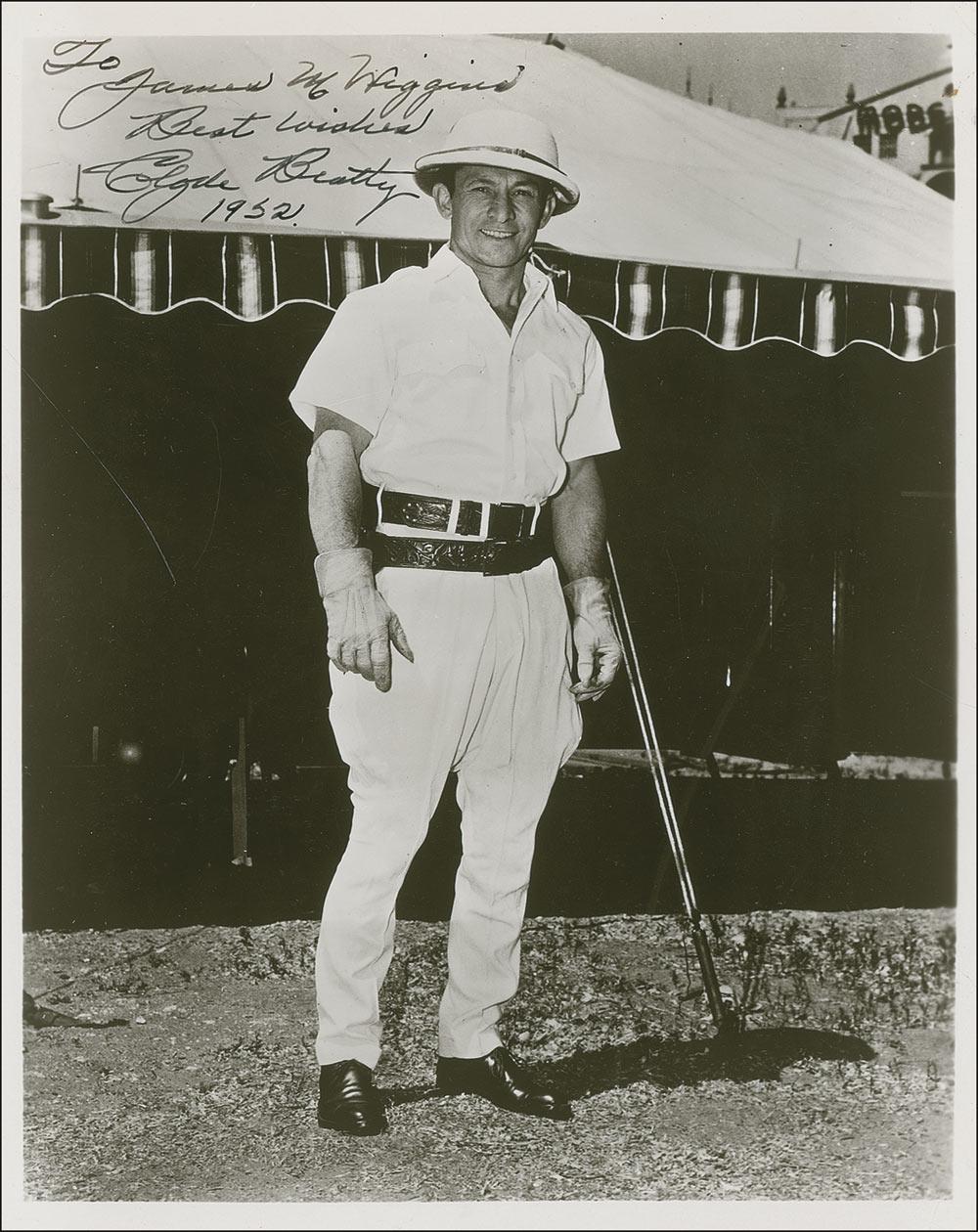 Animal trainer and circus impresario (1903–1965) who appeared in several big-game-themed films in the 1930s–1950s. Glossy 8 x 10 photo of Beatty in front of a big top, signed and inscribed in fountain pen “To James M. Wiggins, Best Wishes, Clyde Beatty, 1952.” In fine condition with a few small creases and dings.