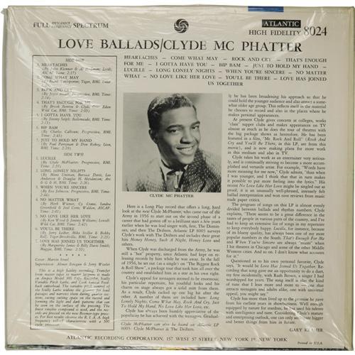 <B>Clyde McPhatter "Love Ballads" LP Atlantic 8024 Mono (1958).</B></I> One of <I>the</B></I> voices of the '50s, the Rock and Roll Hall of Fame singer paved the way for many R&B acts to cross over to Pop and to white audiences. This is his second album, and this copy is incredibly still in its loose plastic shrink. Condition: Still sealed - GM-MT 10/ GM-MT 10. <I>From the GRT Collection</B></I>.