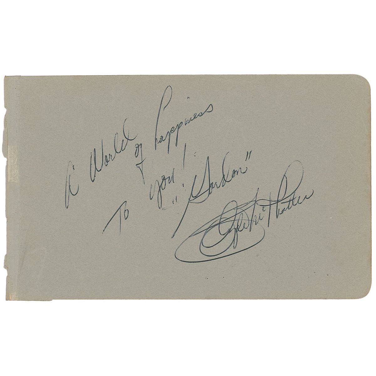 Popular American R&B singer (1932–1972) who recorded such hits as ‘Have Mercy Baby’ and ‘I Never Knew’ before succumbing to alcohol-induced heart, liver, and kidney disease at the age of 39. Vintage ballpoint signature and inscription “A World of Happiness to you! ‘Gordon’ Clyde McPhatter” on a gray 6.25 x 4 album page. In fine condition, with a few light creases and wrinkles.