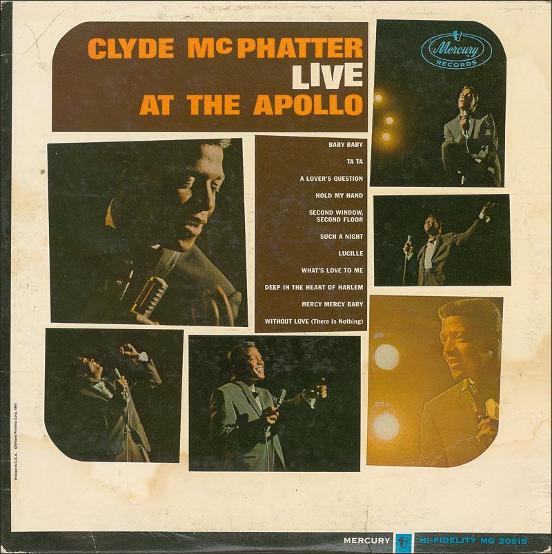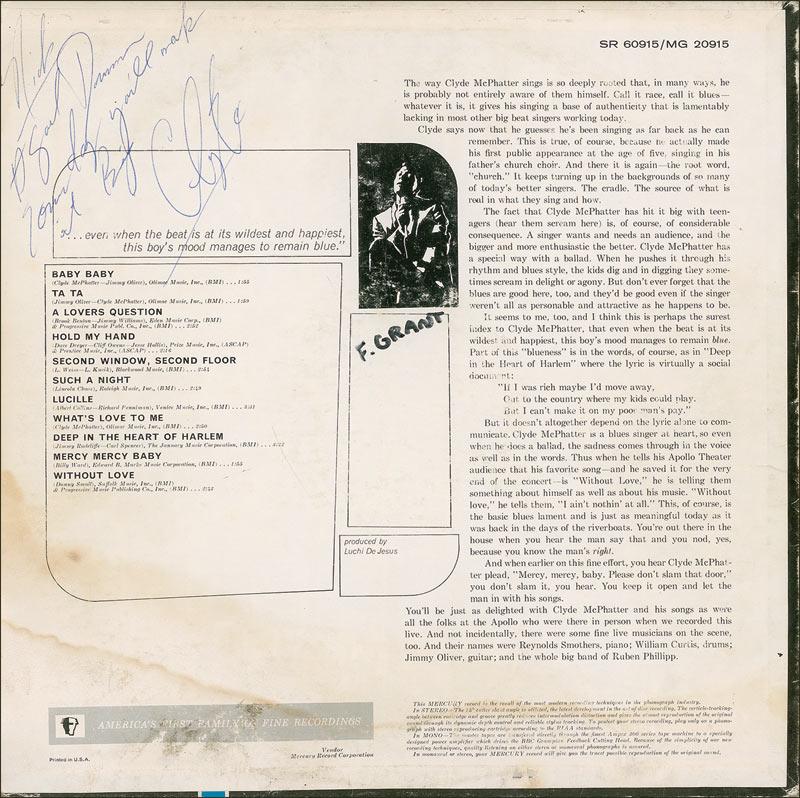 Popular American R&B singer (1932–1972) who recorded such hits as “Have Mercy Baby” and “I Never Knew” before succumbing to alcohol-induced heart, liver, and kidney disease at the age of 39. Clyde McPhatter Live at the Apollo album signed and inscribed on the back cover in blue ballpoint, “Nick, A good drummer, some day you’ll make it big. Clyde.” Scattered toning and damp staining to both covers, edge wear and dings, back cover peeling at lower left corner, and scattered creases, otherwise very good condition. The record is included.