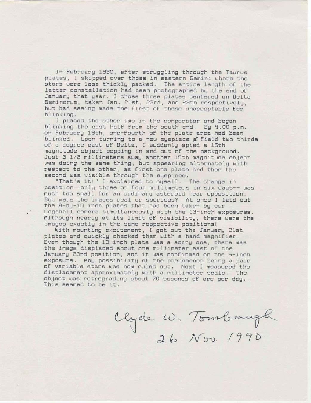 Exciting account by Clyde Tombaugh of the hours leading up to his discovery of Pluto. Typed 8.5'' x 11'' document signed ''Clyde W. Tombaugh / 26 Nov. 1990'' reads in part, ''In February 1930, after struggling through 'Taurus' I skipped [to] eastern Gemini where the stars were less thickly packed. I suddenly spied an object 'That's it!' I exclaimed to myself. Any possibility of the phenomenon being a pair of variable stars was now ruled out. This seemed to be it.'' Tombaugh crosses out an errant ''a'' in description. Near fine condition.